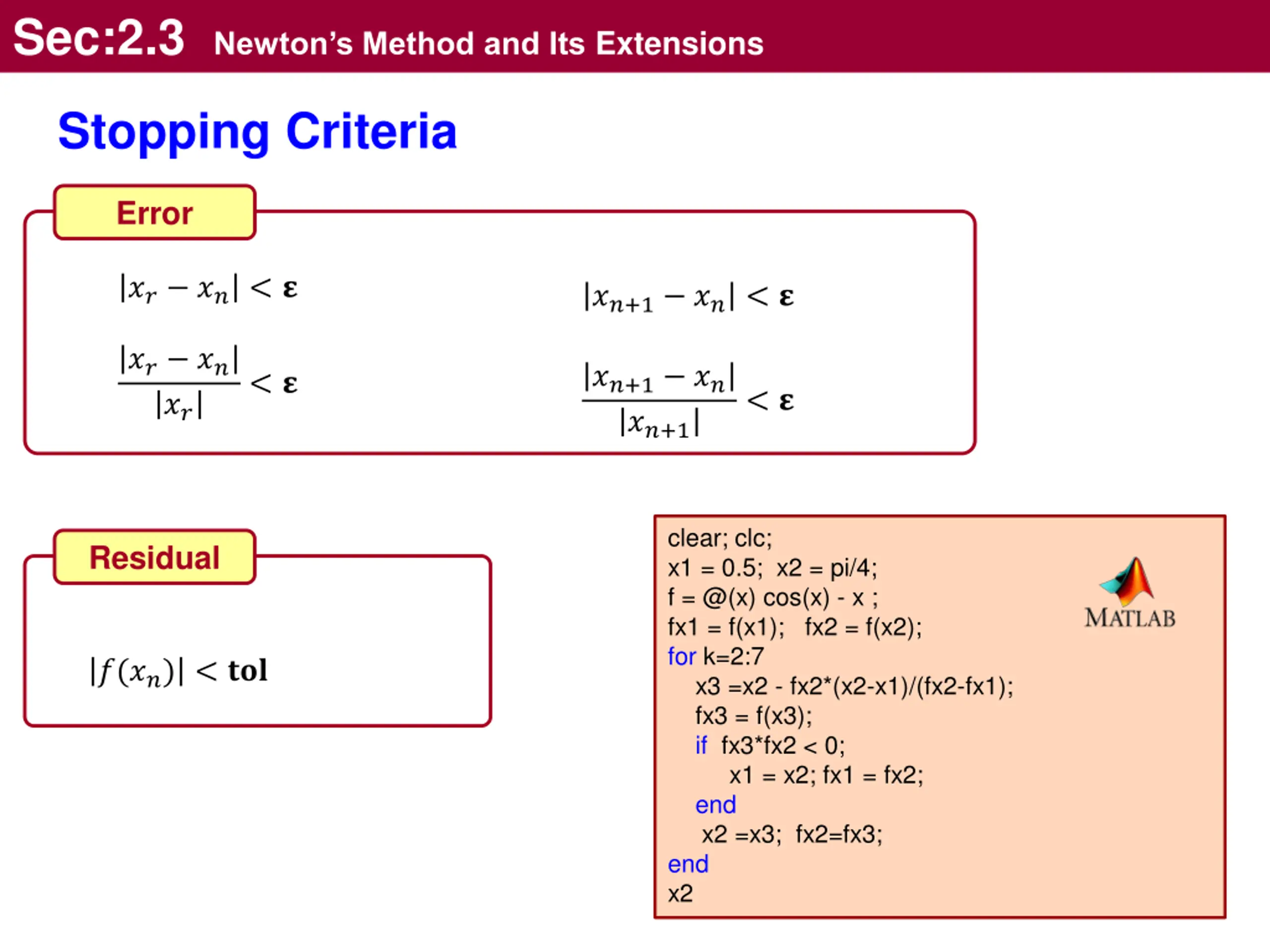 Sec:2.3 Newtons Method and Its Extensions Stopping Criteria Error ?? ?? < ? ??+1 ?? < ? ?? ?? ?? ??+1 ?? ??+1 < ? < ? clear; clc; x1 = 0.5; x2 = pi/4; f = @(x) cos(x) - x ; fx1 = f(x1); fx2 = f(x2); for k=2:7 x3 =x2 - fx2*(x2-x1)/(fx2-fx1); fx3 = f(x3); if fx3*fx2 < 0; x1 = x2; fx1 = fx2; end x2 =x3; fx2=fx3; end x2 Residual ?(??) < ???