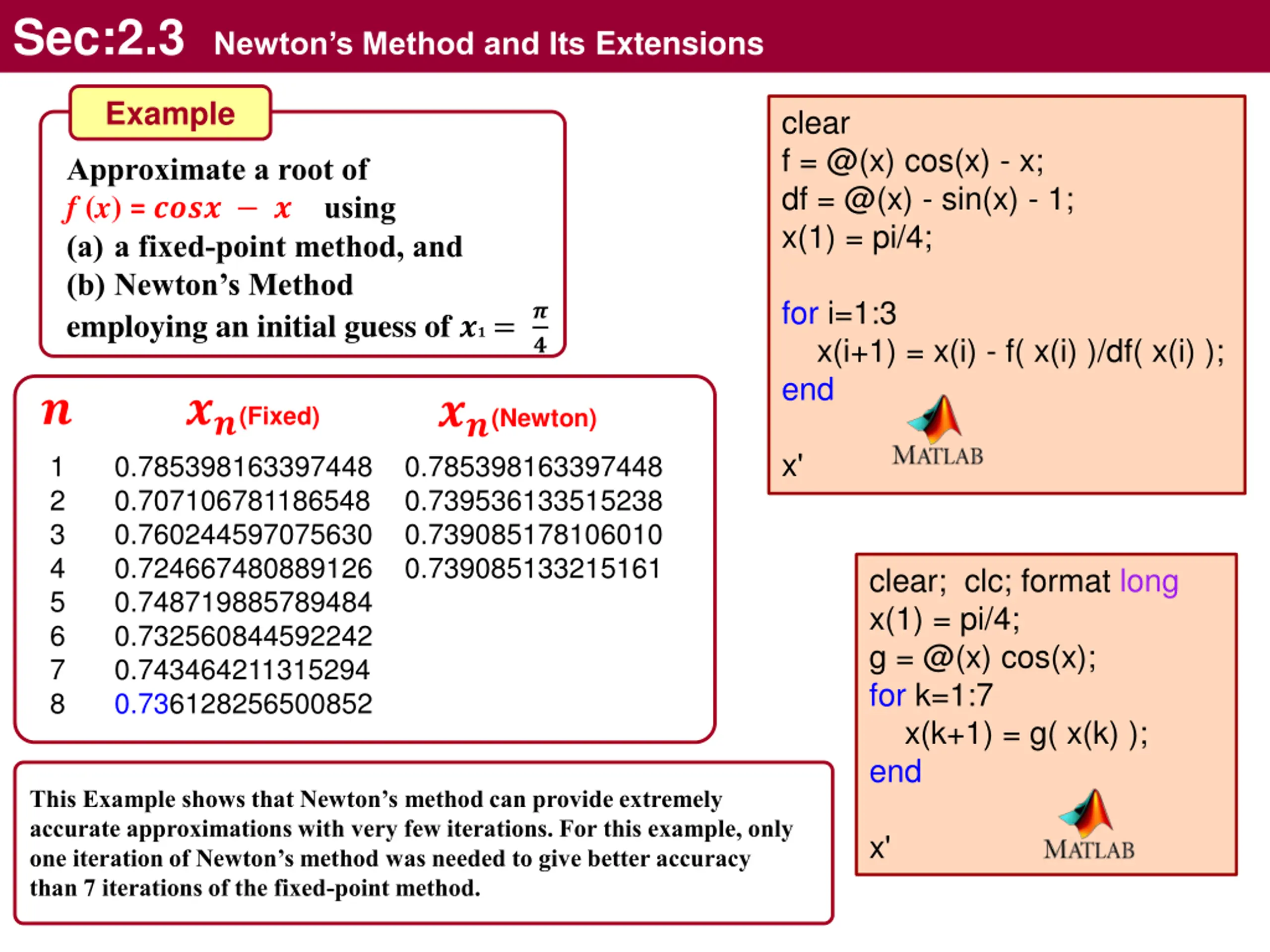 Sec:2.3 Newtons Method and Its Extensions Example clear f = @(x) cos(x) - x; df = @(x) - sin(x) - 1; x(1) = pi/4; Approximate a root of f (x) = ???? ? (a) a fixed-point method, and (b) Newton s Method employing an initial guess of ?? = using for i=1:3 x(i+1) = x(i) - f( x(i) )/df( x(i) ); end ? ? ? ??(Fixed) ??(Newton) x' 1 2 3 4 5 6 7 8 0.785398163397448 0.707106781186548 0.760244597075630 0.724667480889126 0.748719885789484 0.732560844592242 0.743464211315294 0.736128256500852 0.785398163397448 0.739536133515238 0.739085178106010 0.739085133215161 clear; clc; format long x(1) = pi/4; g = @(x) cos(x); for k=1:7 x(k+1) = g( x(k) ); end This Example shows that Newton s method can provide extremely accurate approximations with very few iterations. For this example, only one iteration of Newton s method was needed to give better accuracy than 7 iterations of the fixed-point method. x'