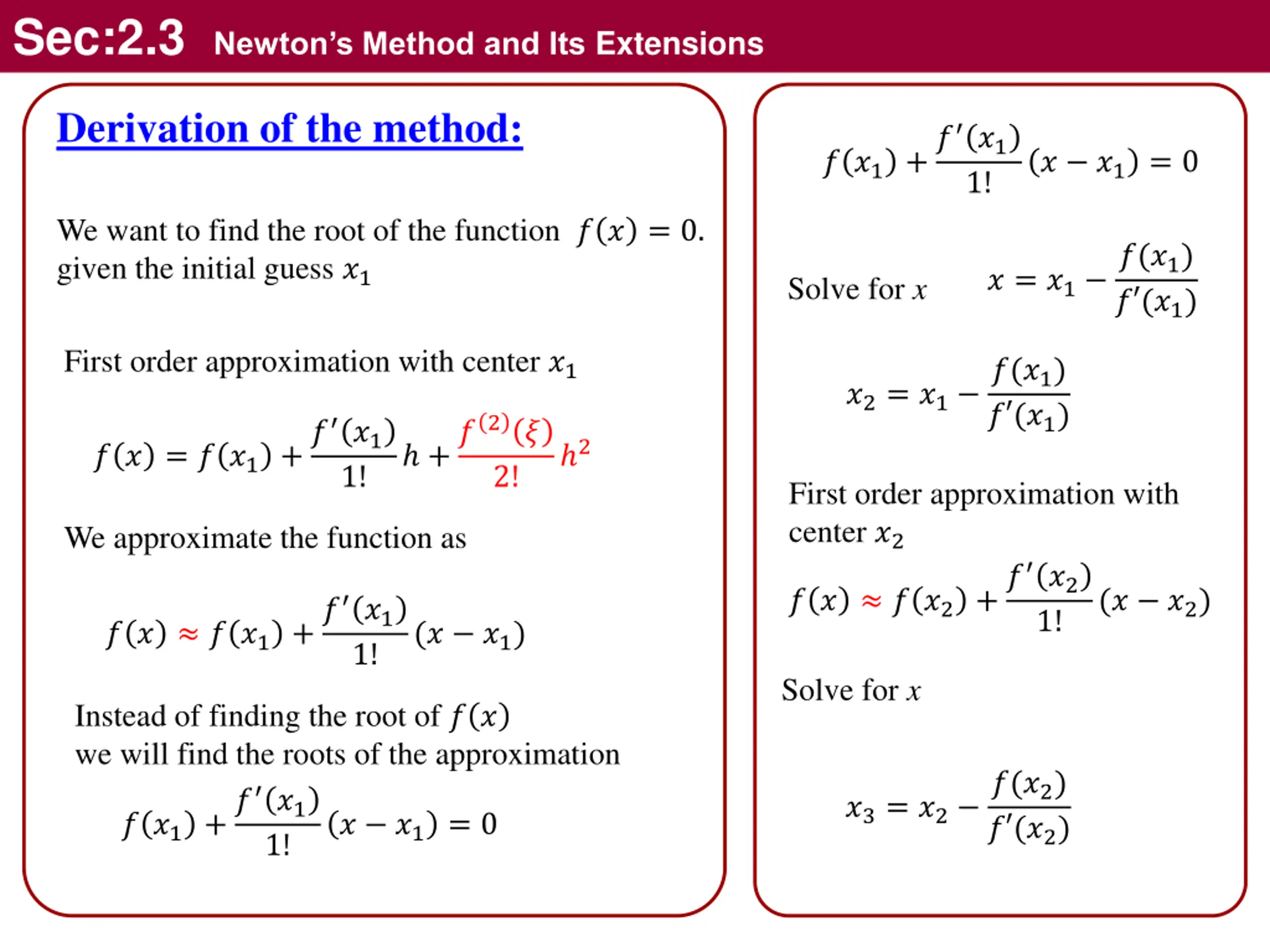 Sec:2.3 Newtons Method and Its Extensions Derivation of the method: ? ?1 +? ?1 ? ?1 = 0 1! We want to find the root of the function ? ? = 0. given the initial guess ?1 ? = ?1 ?(?1) Solve for x ? (?1) First order approximation with center ?1 ?2= ?1 ?(?1) ? (?1) ? ? = ? ?1 +? ?1 +?2? 2 1! 2! First order approximation with center ?2 ? ? ? ?2 +? ?2 We approximate the function as (? ?2) ? ? ? ?1 +? ?1 1! (? ?1) 1! Solve for x Instead of finding the root of ? ? we will find the roots of the approximation ? ?1 +? ?1 1! ?3= ?2 ?(?2) ? ?1 = 0 ? (?2)