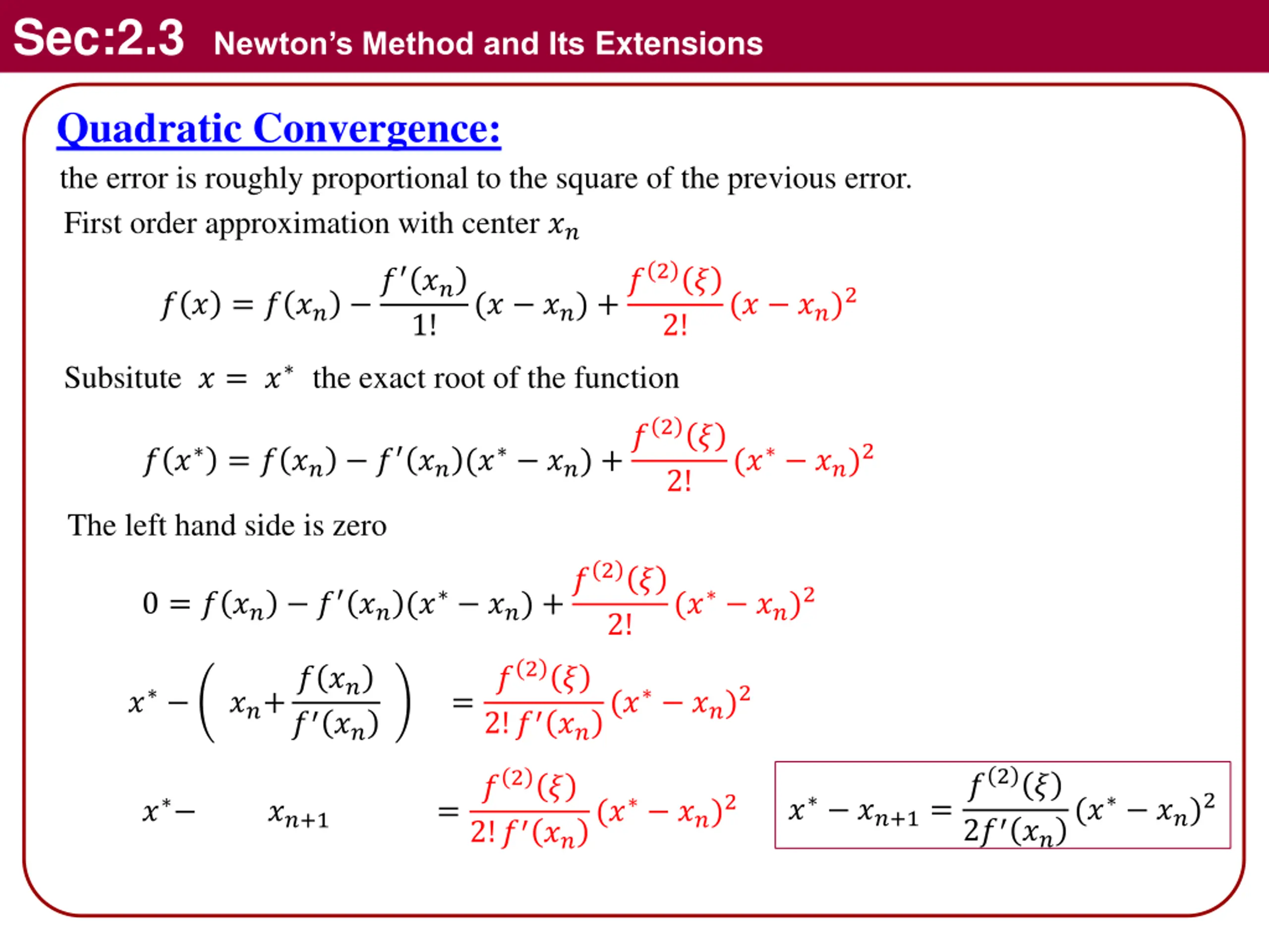 Sec:2.3 Newtons Method and Its Extensions Quadratic Convergence: the error is roughly proportional to the square of the previous error. First order approximation with center ?? ? ? = ? ?? ? ?? (? ??) +?2? (? ??)2 1! 2! Subsitute ? = ? the exact root of the function ? ? = ? ?? ? ??(? ??) +?2? (? ??)2 2! The left hand side is zero 0 = ? ?? ? ??(? ??) +?2? (? ??)2 2! ?2? 2!? ?? ??+? ?? ? ?? ? (? ??)2 = ? ??+1=?2? ?2? 2!? ?? (? ??)2 ? (? ??)2 ??+1 = 2? ??
