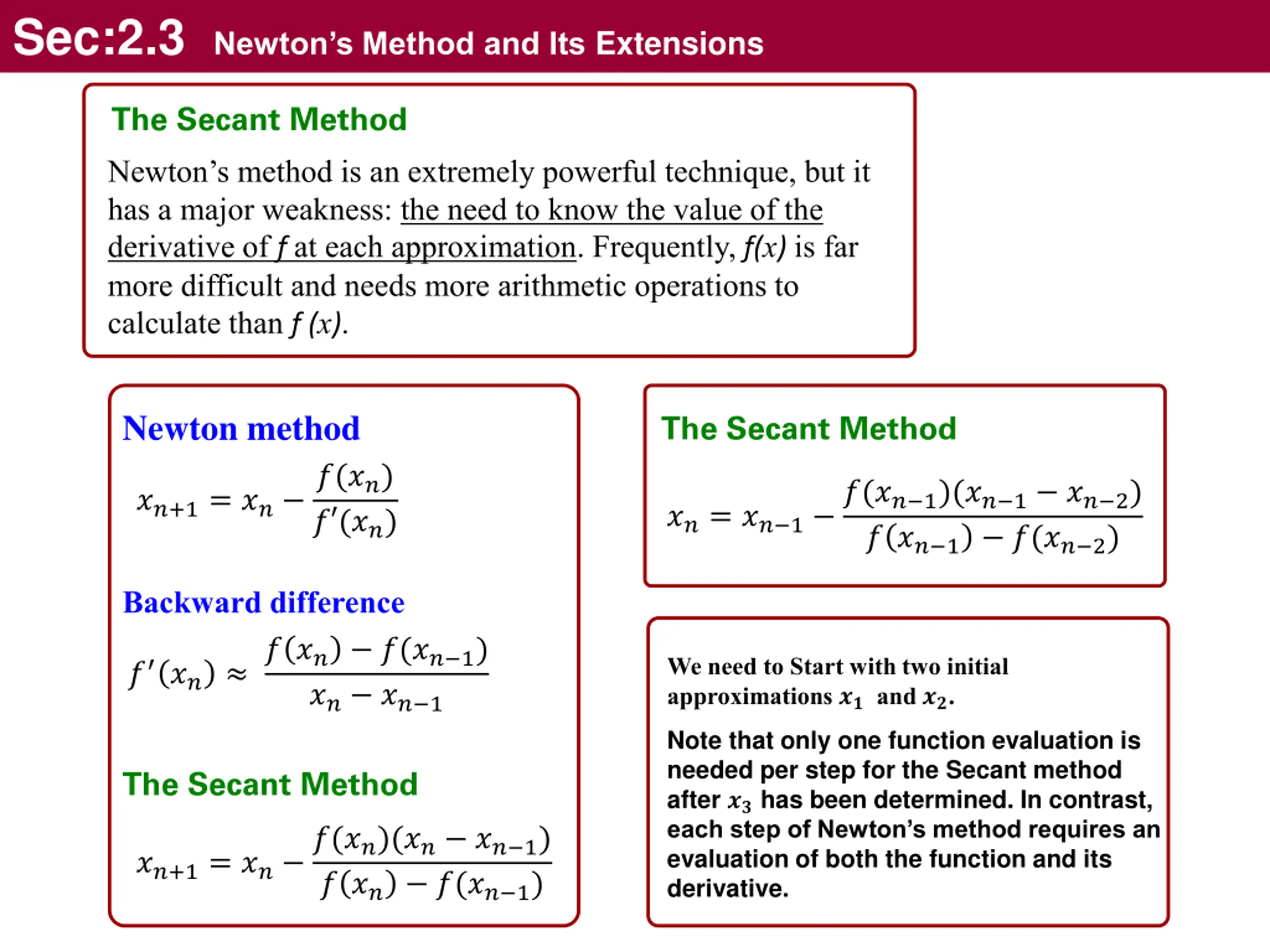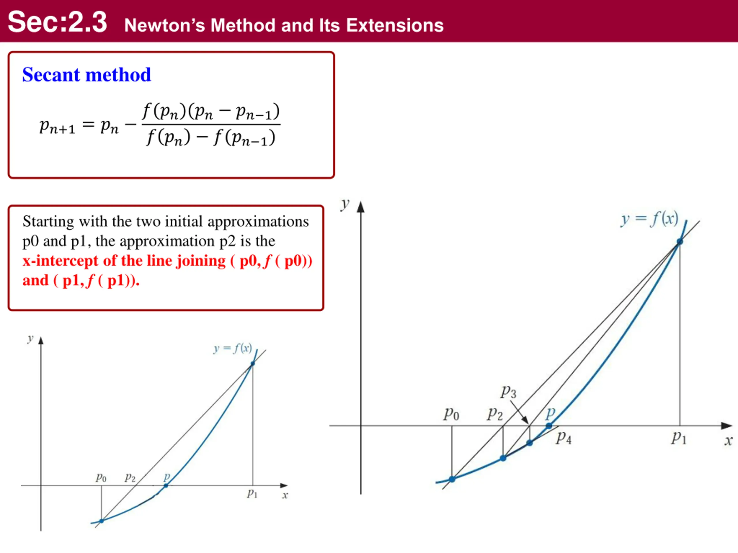 Sec:2.3 Newtons Method and Its Extensions Secant method ??+1= ?? ?(??)(?? ?? 1) ? ?? ?(?? 1) Starting with the two initial approximations p0 and p1, the approximation p2 is the x-intercept of the line joining ( p0, f ( p0)) and ( p1, f ( p1)).