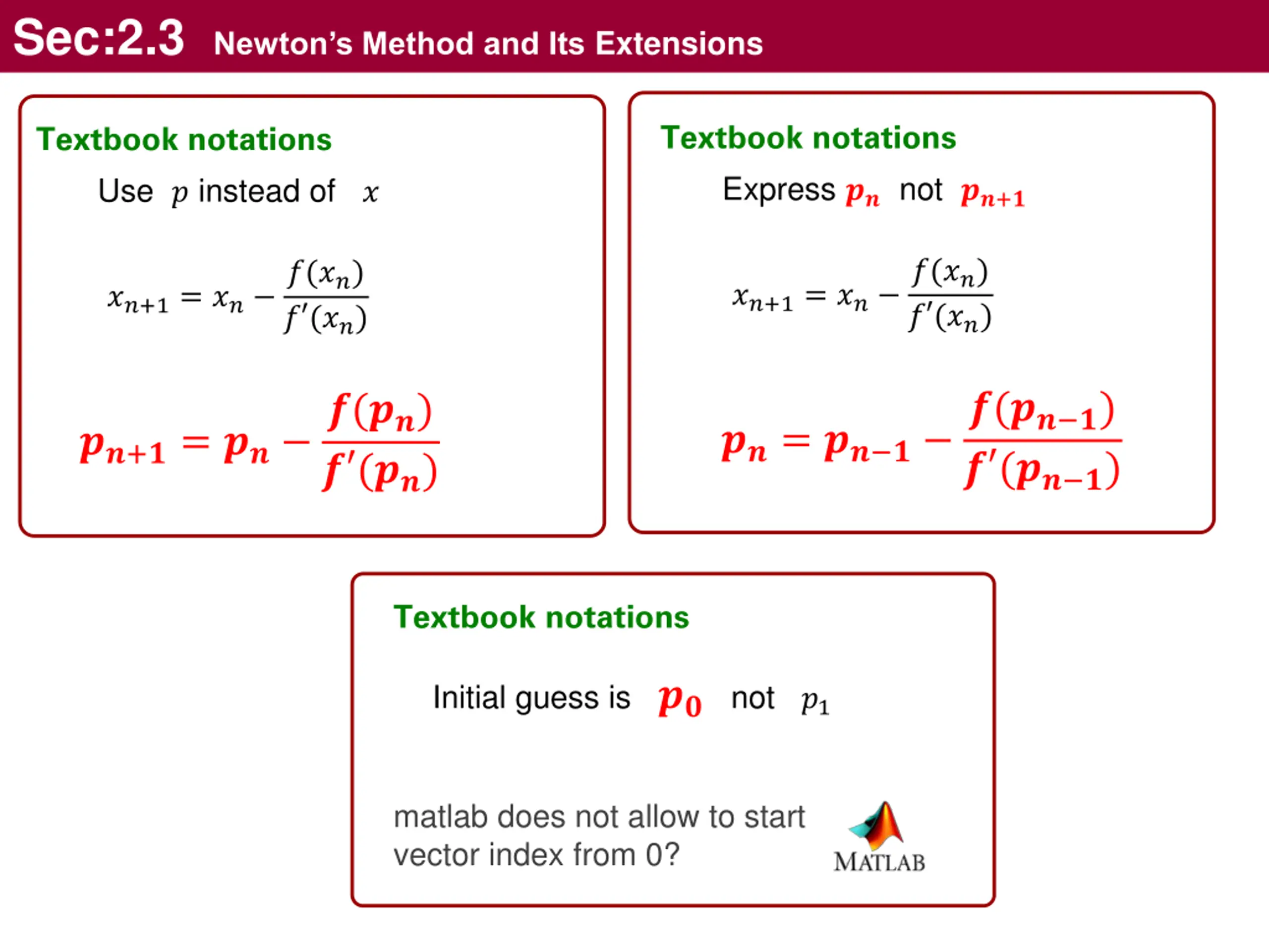 Sec:2.3 Newtons Method and Its Extensions Textbook notations Express ??not ??+? Textbook notations Use ? instead of ? ??+1= ?? ?(??) ??+1= ?? ?(??) ? (??) ? (??) ??= ?? ? ?(?? ?) ??+?= ?? ?(??) ? (?? ?) ? (??) Textbook notations Initial guess is ?? not ?1 matlab does not allow to start vector index from 0?