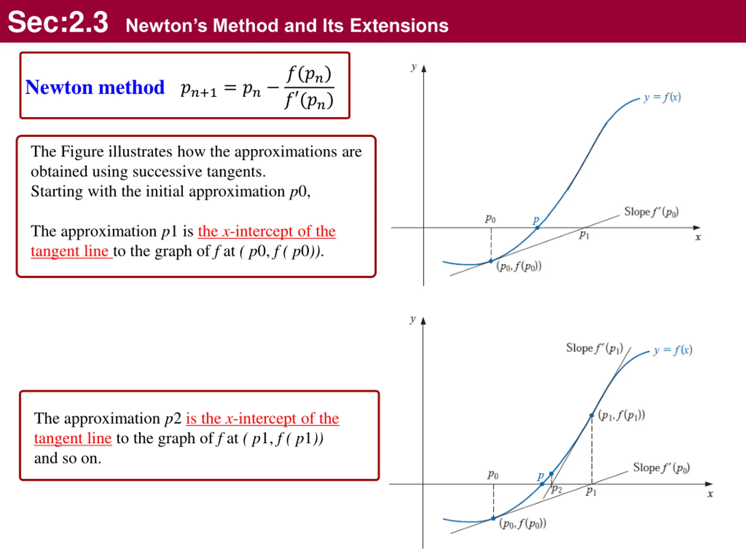 Sec:2.3 Newtons Method and Its Extensions ??+1= ?? ?(??) Newton method ? (??) The Figure illustrates how the approximations are obtained using successive tangents. Starting with the initial approximation p0, The approximation p1 is the x-intercept of the tangent line to the graph of f at ( p0, f ( p0)). The approximation p2 is the x-intercept of the tangent line to the graph of f at ( p1, f ( p1)) and so on.