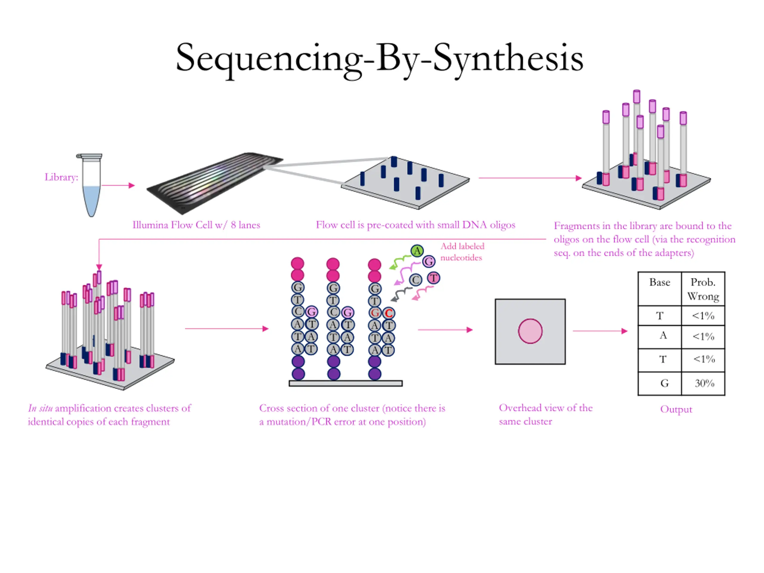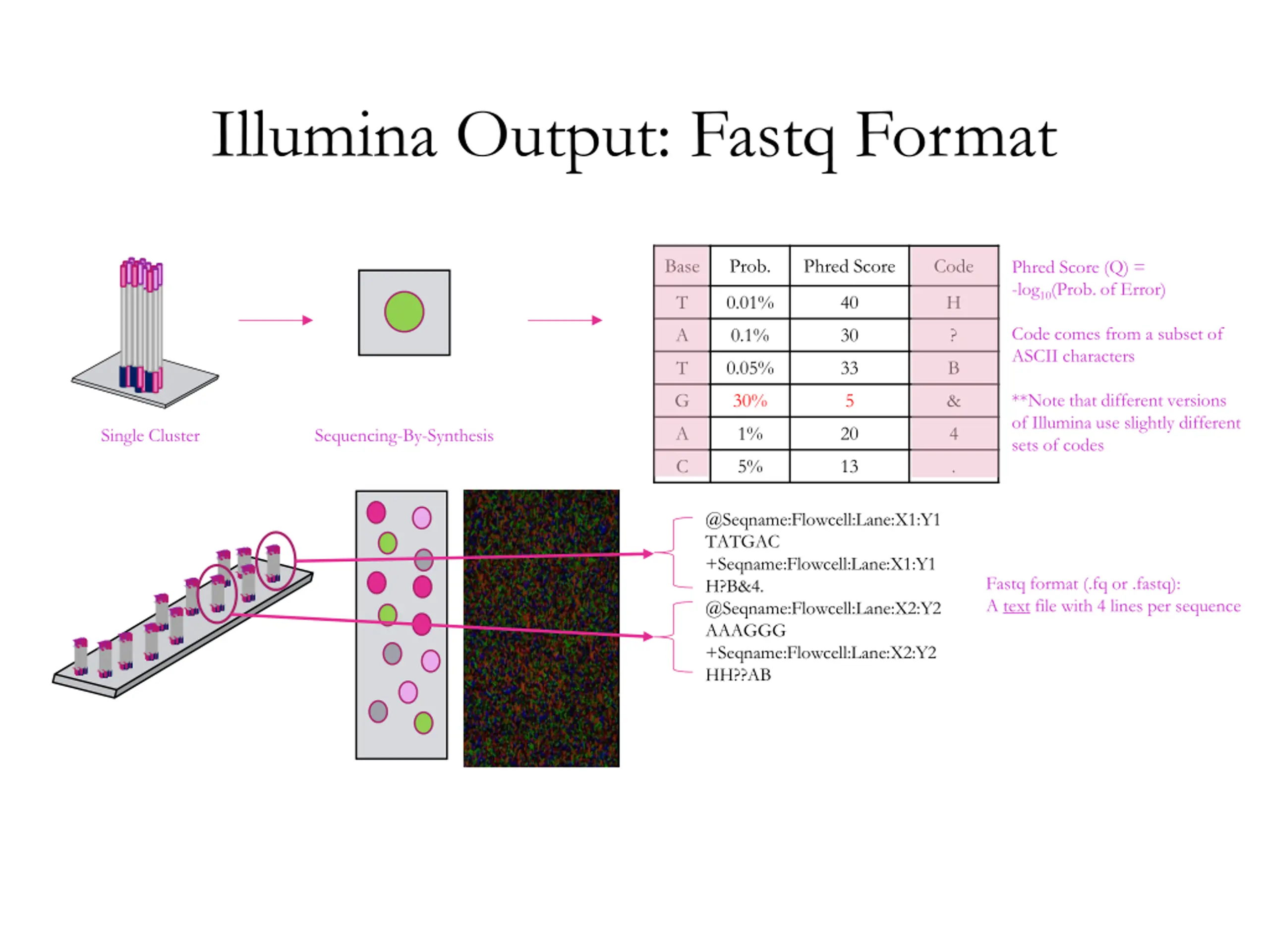 Sequencing-By-Synthesis Library: Flow cell is pre-coated with small DNA oligos Illumina Flow Cell w/ 8 lanes Fragments in the library are bound to the oligos on the flow cell (via the recognition seq. on the ends of the adapters) Add labeled nucleotides A G T C Base Prob. Wrong G G G T T T C G C G G C T <1% T T A T T A T T A A <1% T A A T A A T A A T T A T T A T T A <1% T 30% G Overhead view of the same cluster In situ amplification creates clusters of identical copies of each fragment Cross section of one cluster (notice there is a mutation/PCR error at one position) Output