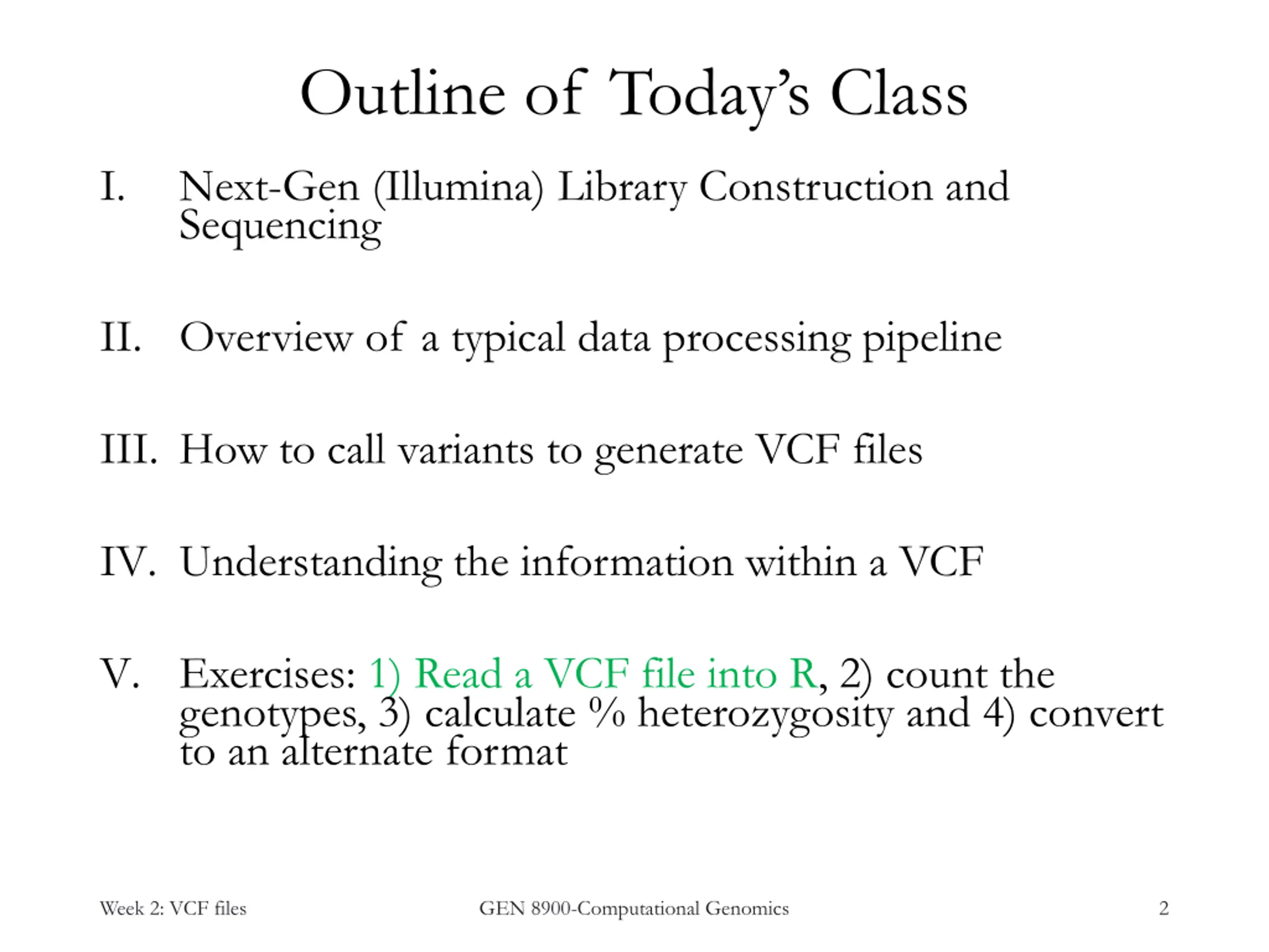 Outline of Todays Class I. Next-Gen (Illumina) Library Construction and Sequencing II. Overview of a typical data processing pipeline III. How to call variants to generate VCF files IV. Understanding the information within a VCF V. Exercises: 1) Read a VCF file into R, 2) count the genotypes, 3) calculate % heterozygosity and 4) convert to an alternate format Week 2: VCF files GEN 8900-Computational Genomics 2