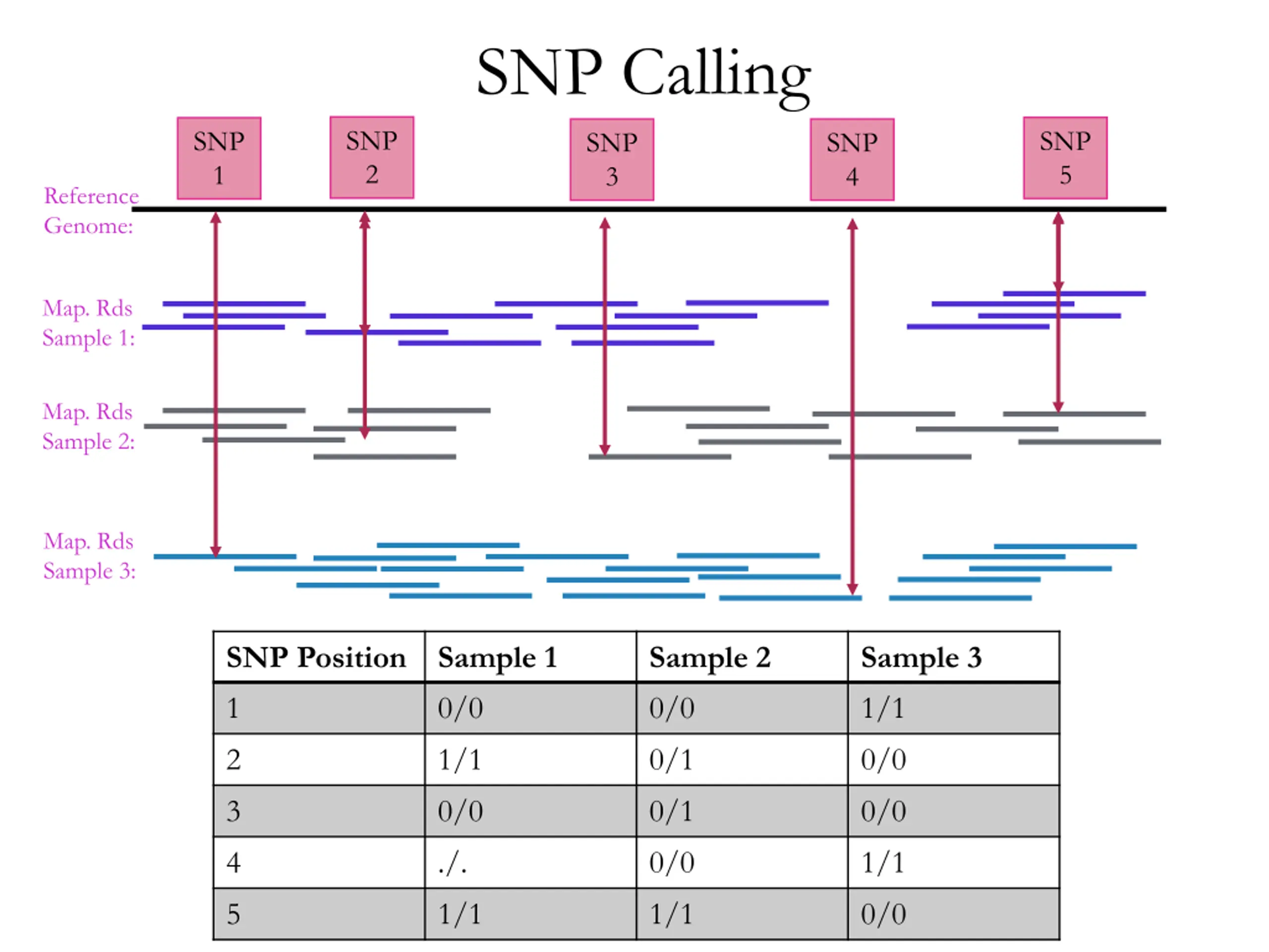 SNP Calling SNP 2 SNP 5 SNP 1 SNP 3 SNP 4 Reference Genome: Map. Rds Sample 1: Map. Rds Sample 2: Map. Rds Sample 3: SNP Position 1 2 3 4 5 Sample 1 0/0 1/1 0/0 ./. 1/1 Sample 2 0/0 0/1 0/1 0/0 1/1 Sample 3 1/1 0/0 0/0 1/1 0/0