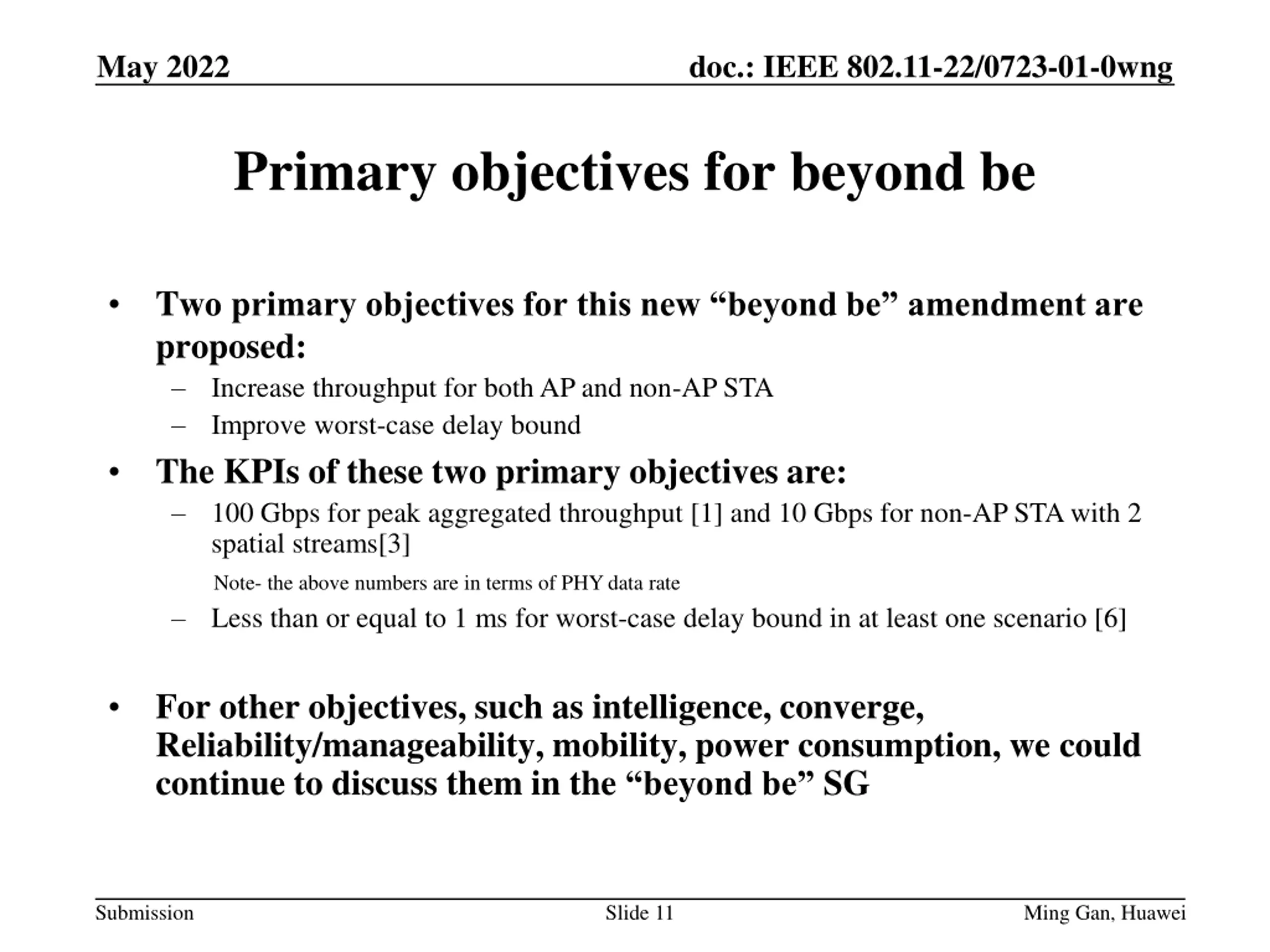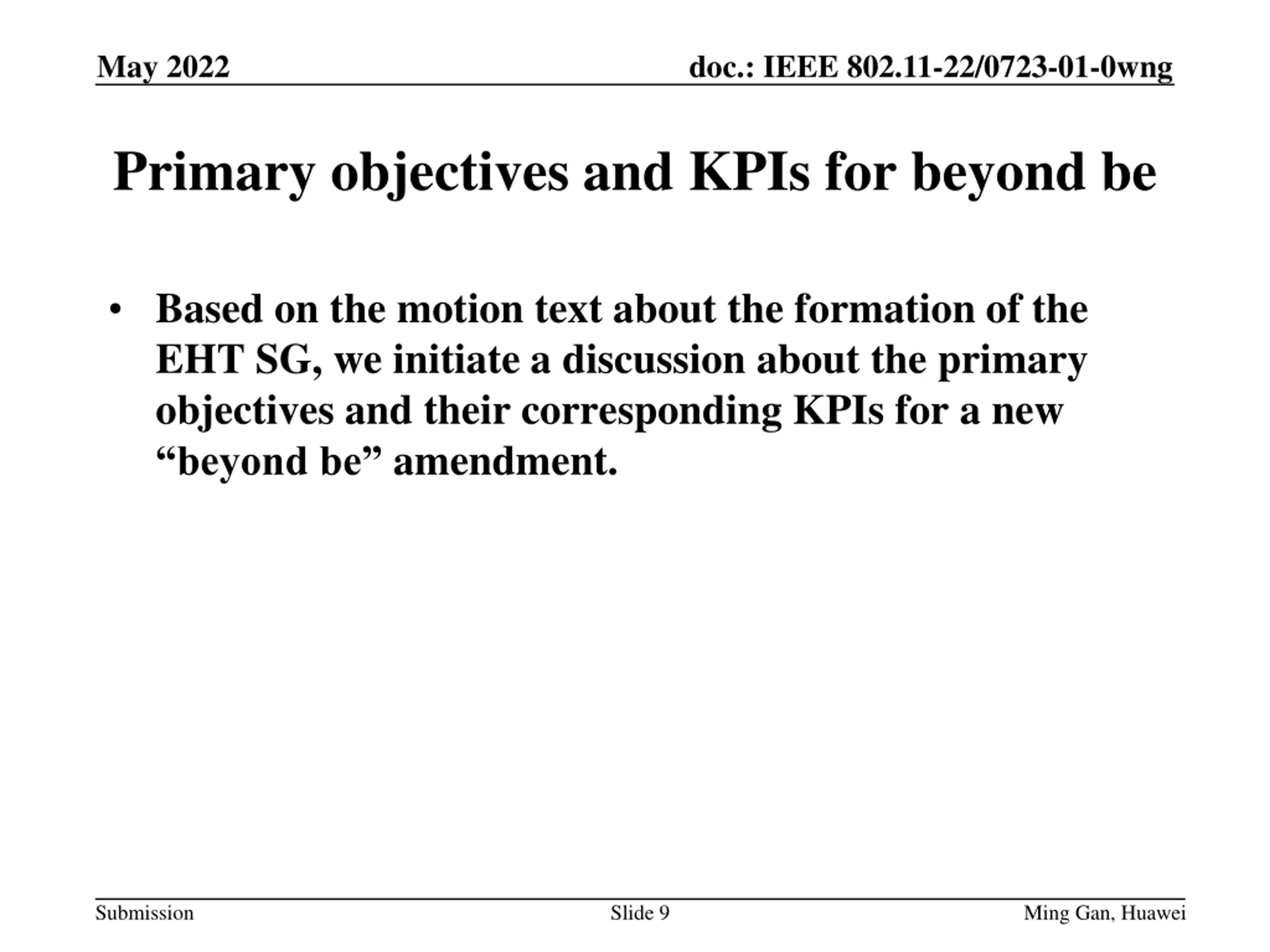 May 2022 doc.: IEEE 802.11-22/0723-01-0wng Primary objectives and KPIs for beyond be Based on the motion text about the formation of the EHT SG, we initiate a discussion about the primary objectives and their corresponding KPIs for a new beyond be amendment. Submission Slide 9 Ming Gan, Huawei