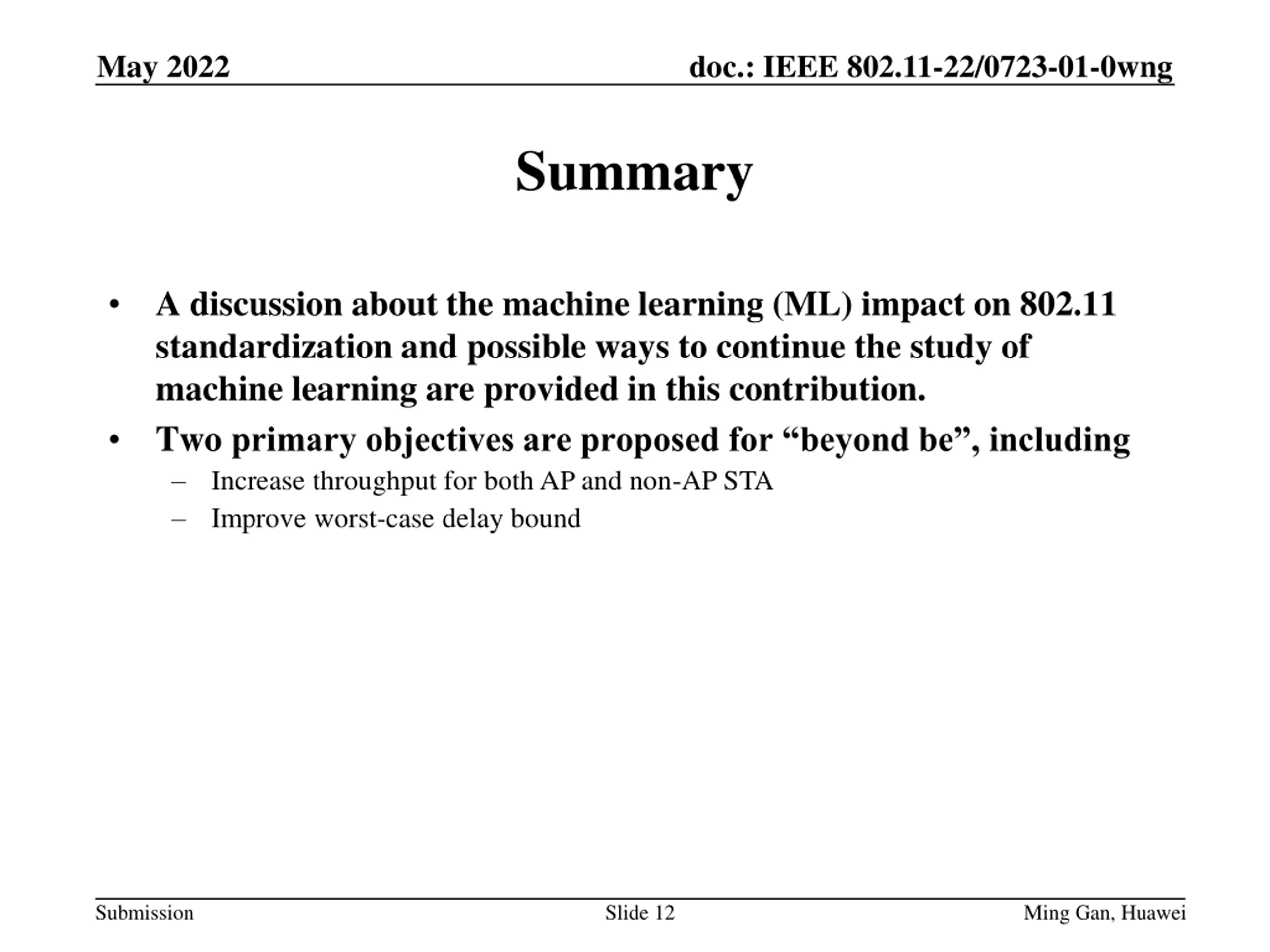 May 2022 doc.: IEEE 802.11-22/0723-01-0wng Summary A discussion about the machine learning (ML) impact on 802.11 standardization and possible ways to continue the study of machine learning are provided in this contribution. Two primary objectives are proposed for beyond be , including Increase throughput for both AP and non-AP STA Improve worst-case delay bound Submission Slide 12 Ming Gan, Huawei