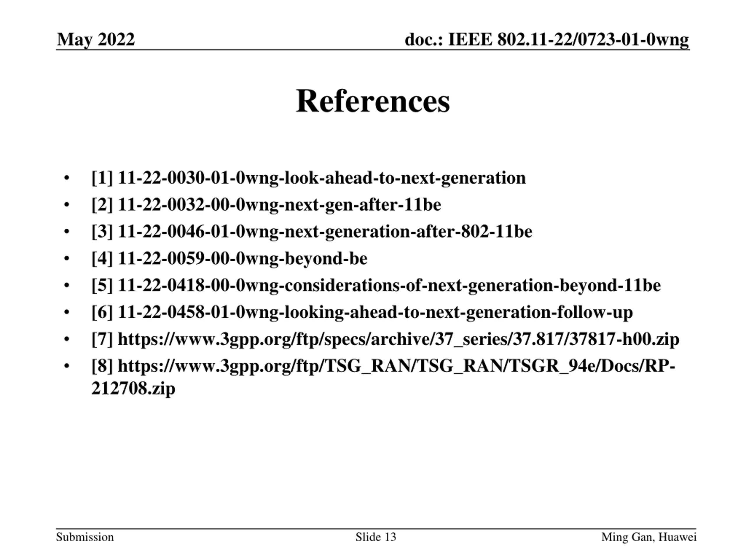 May 2022 doc.: IEEE 802.11-22/0723-01-0wng References [1] 11-22-0030-01-0wng-look-ahead-to-next-generation [2] 11-22-0032-00-0wng-next-gen-after-11be [3] 11-22-0046-01-0wng-next-generation-after-802-11be [4] 11-22-0059-00-0wng-beyond-be [5] 11-22-0418-00-0wng-considerations-of-next-generation-beyond-11be [6] 11-22-0458-01-0wng-looking-ahead-to-next-generation-follow-up [7] https://www.3gpp.org/ftp/specs/archive/37_series/37.817/37817-h00.zip [8] https://www.3gpp.org/ftp/TSG_RAN/TSG_RAN/TSGR_94e/Docs/RP- 212708.zip Submission Slide 13 Ming Gan, Huawei