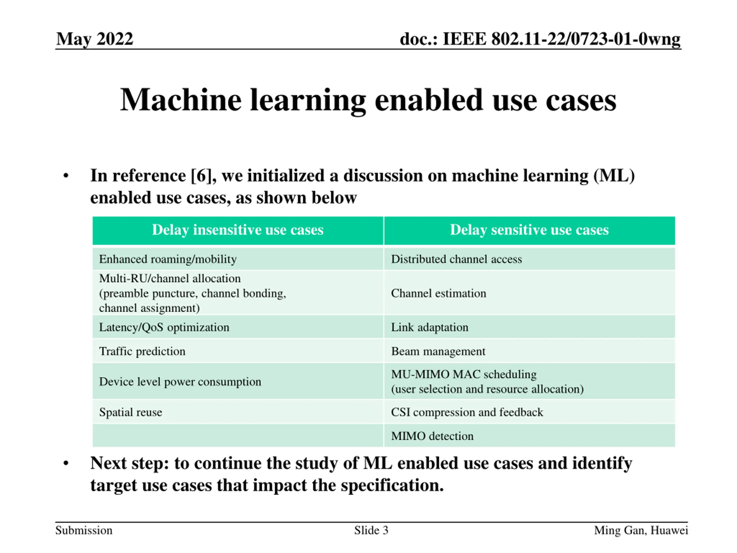 May 2022 doc.: IEEE 802.11-22/0723-01-0wng Machine learning enabled use cases In reference [6], we initialized a discussion on machine learning (ML) enabled use cases, as shown below Delay insensitive use cases Delay sensitive use cases Enhanced roaming/mobility Multi-RU/channel allocation (preamble puncture, channel bonding, channel assignment) Latency/QoS optimization Distributed channel access Channel estimation Link adaptation Traffic prediction Beam management MU-MIMO MAC scheduling (user selection and resource allocation) Device level power consumption Spatial reuse CSI compression and feedback MIMO detection Next step: to continue the study of ML enabled use cases and identify target use cases that impact the specification. Submission Slide 3 Ming Gan, Huawei