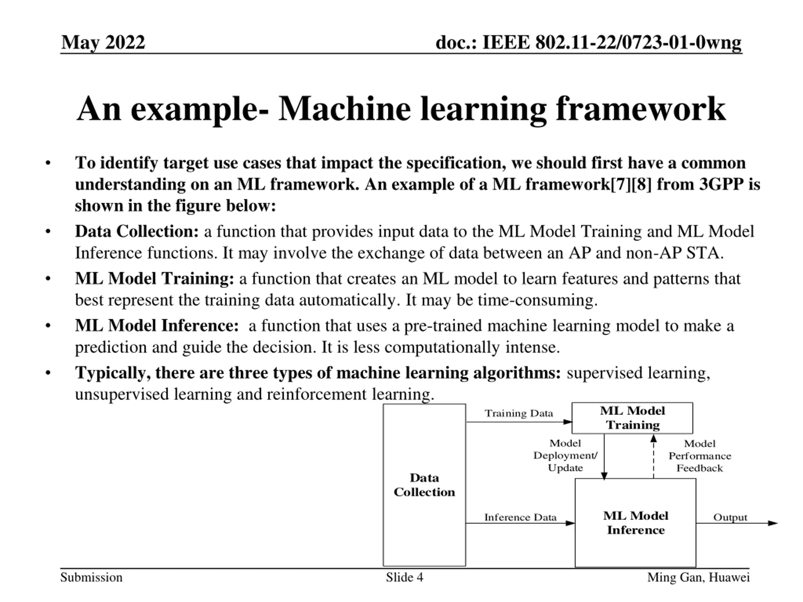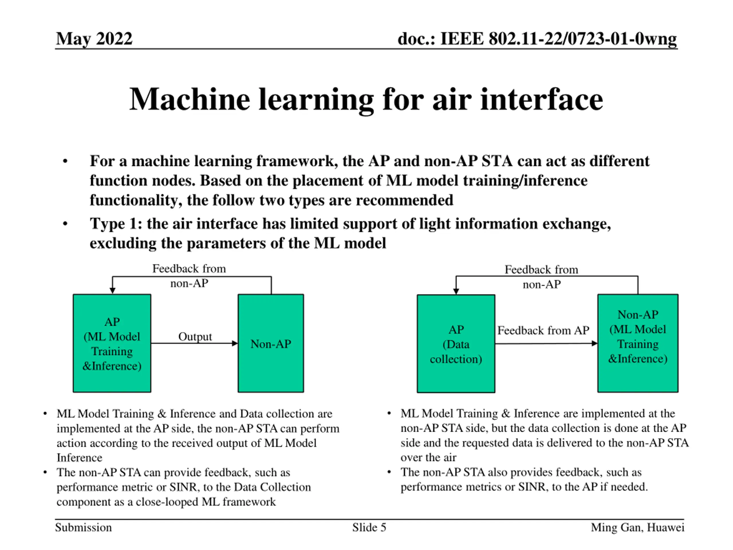 May 2022 doc.: IEEE 802.11-22/0723-01-0wng An example- Machine learning framework To identify target use cases that impact the specification, we should first have a common understanding on an ML framework. An example of a ML framework[7][8] from 3GPP is shown in the figure below: Data Collection: a function that provides input data to the ML Model Training and ML Model Inference functions. It may involve the exchange of data between an AP and non-AP STA. ML Model Training: a function that creates an ML model to learn features and patterns that best represent the training data automatically. It may be time-consuming. ML Model Inference: a function that uses a pre-trained machine learning model to make a prediction and guide the decision. It is less computationally intense. Typically, there are three types of machine learning algorithms: supervised learning, unsupervised learning and reinforcement learning. ML Model Training Training Data Model Deployment/ Update Model Performance Feedback Data Collection ML Model Inference Inference Data Output Submission Slide 4 Ming Gan, Huawei