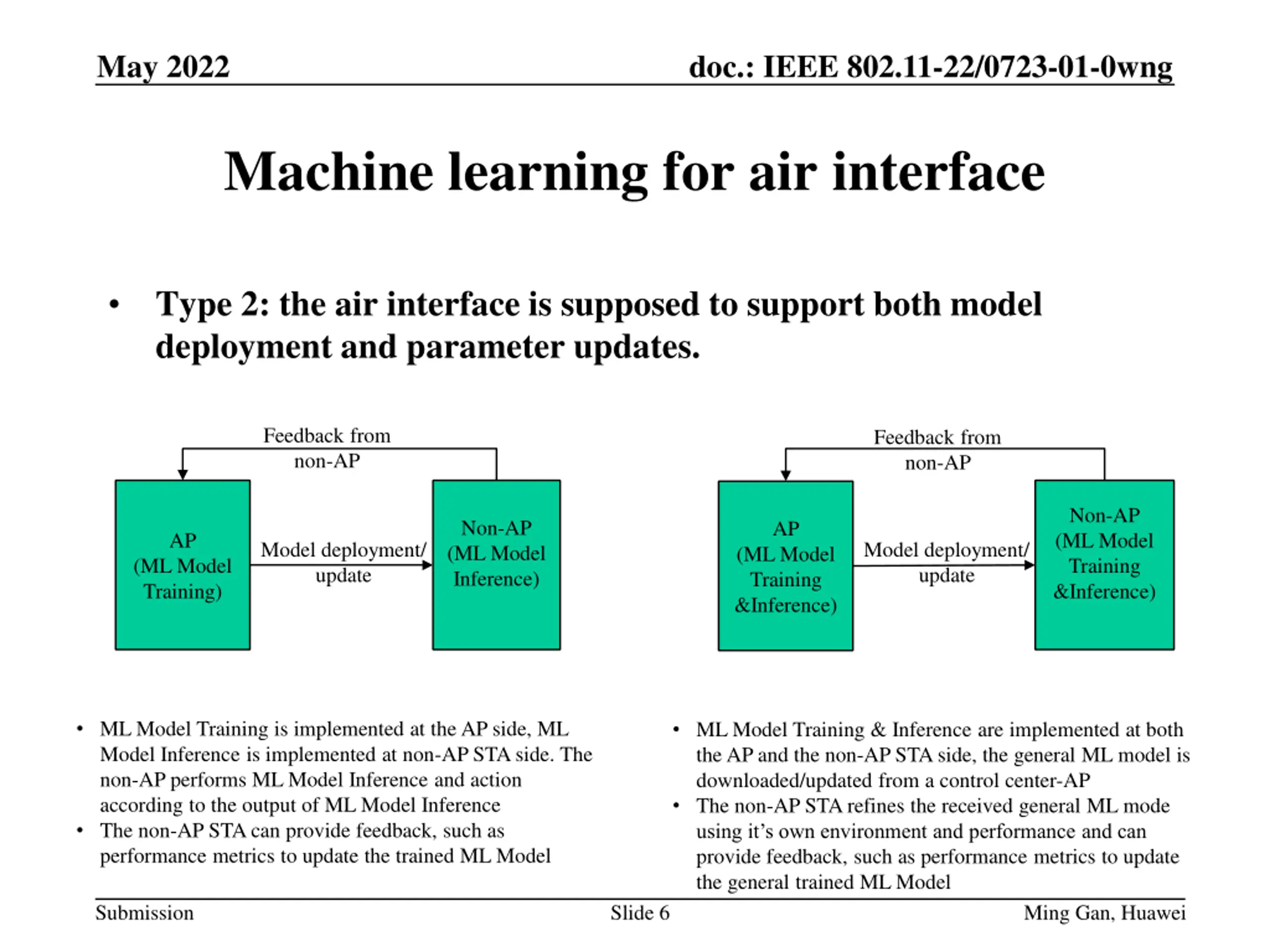 May 2022 doc.: IEEE 802.11-22/0723-01-0wng Machine learning for air interface For a machine learning framework, the AP and non-AP STA can act as different function nodes. Based on the placement of ML model training/inference functionality, the follow two types are recommended Type 1: the air interface has limited support of light information exchange, excluding the parameters of the ML model Feedback from non-AP Feedback from non-AP Non-AP (ML Model Training &Inference) AP AP (Data collection) Feedback from AP (ML Model Training &Inference) Output Non-AP ML Model Training & Inference are implemented at the non-AP STA side, but the data collection is done at the AP side and the requested data is delivered to the non-AP STA over the air The non-AP STA also provides feedback, such as performance metrics or SINR, to the AP if needed. ML Model Training & Inference and Data collection are implemented at the AP side, the non-AP STA can perform action according to the received output of ML Model Inference The non-AP STA can provide feedback, such as performance metric or SINR, to the Data Collection component as a close-looped ML framework Submission Slide 5 Ming Gan, Huawei