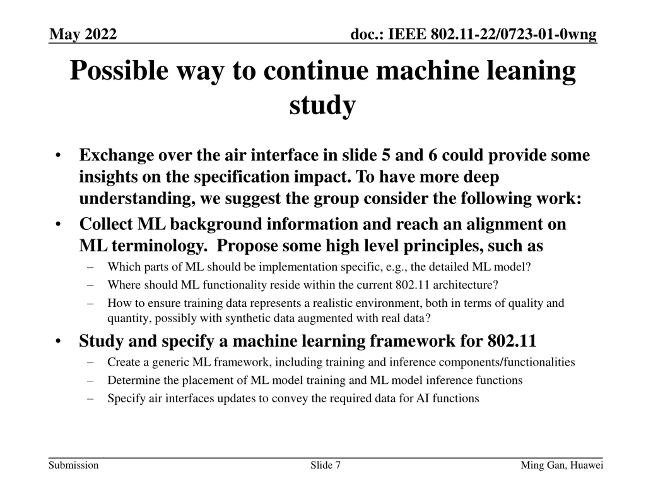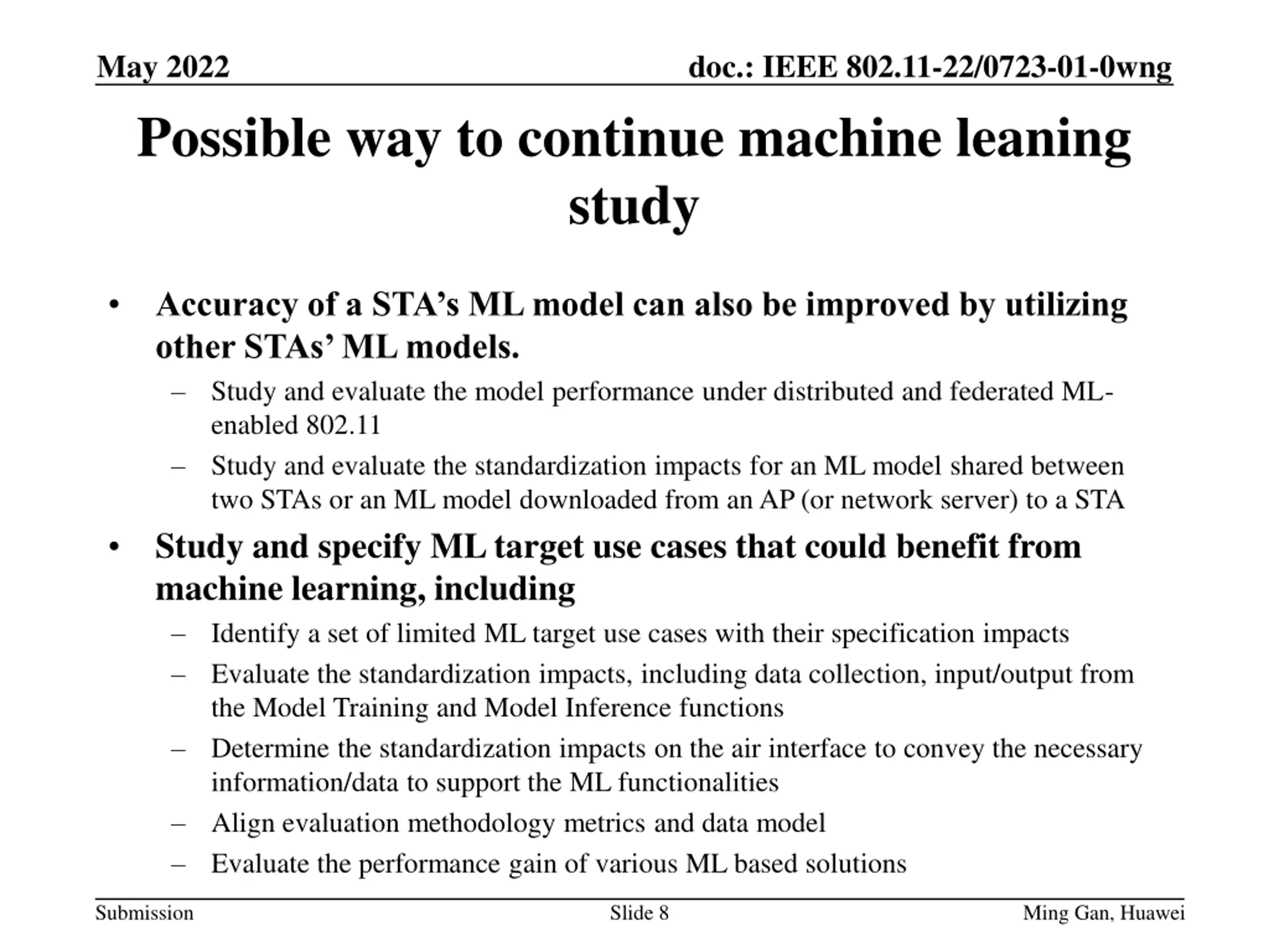 May 2022 doc.: IEEE 802.11-22/0723-01-0wng Possible way to continue machine leaning study Exchange over the air interface in slide 5 and 6 could provide some insights on the specification impact. To have more deep understanding, we suggest the group consider the following work: Collect ML background information and reach an alignment on ML terminology. Propose some high level principles, such as Which parts of ML should be implementation specific, e.g., the detailed ML model? Where should ML functionality reside within the current 802.11 architecture? How to ensure training data represents a realistic environment, both in terms of quality and quantity, possibly with synthetic data augmented with real data? Study and specify a machine learning framework for 802.11 Create a generic ML framework, including training and inference components/functionalities Determine the placement of ML model training and ML model inference functions Specify air interfaces updates to convey the required data for AI functions Submission Slide 7 Ming Gan, Huawei