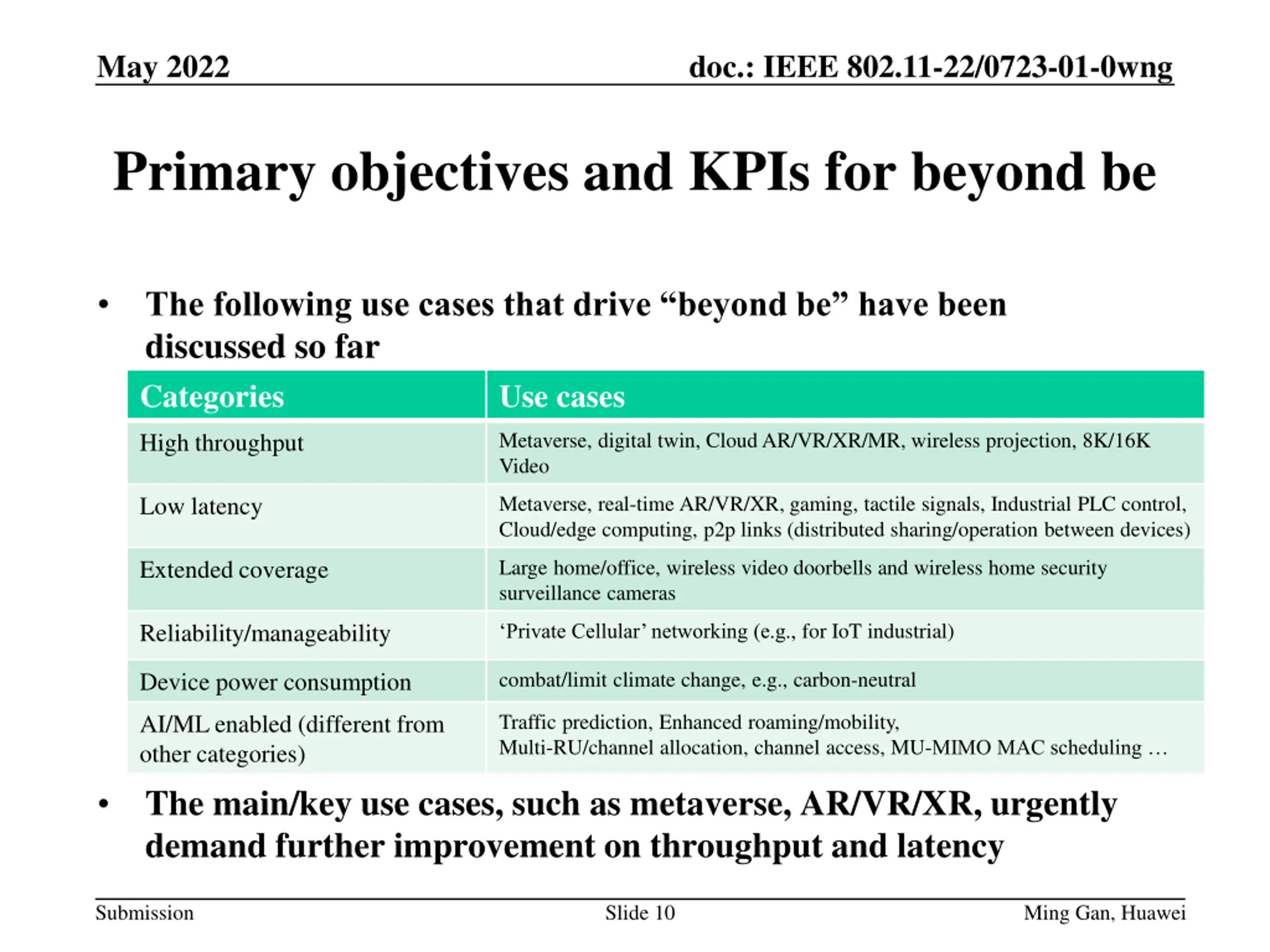 May 2022 doc.: IEEE 802.11-22/0723-01-0wng Primary objectives and KPIs for beyond be The following use cases that drive beyond be have been discussed so far Categories Use cases Metaverse, digital twin, Cloud AR/VR/XR/MR, wireless projection, 8K/16K Video High throughput Metaverse, real-time AR/VR/XR, gaming, tactile signals, Industrial PLC control, Cloud/edge computing, p2p links (distributed sharing/operation between devices) Low latency Large home/office, wireless video doorbells and wireless home security surveillance cameras Extended coverage Private Cellular networking (e.g., for IoT industrial) Reliability/manageability combat/limit climate change, e.g., carbon-neutral Device power consumption Traffic prediction, Enhanced roaming/mobility, Multi-RU/channel allocation, channel access, MU-MIMO MAC scheduling AI/ML enabled (different from other categories) The main/key use cases, such as metaverse, AR/VR/XR, urgently demand further improvement on throughput and latency Submission Slide 10 Ming Gan, Huawei