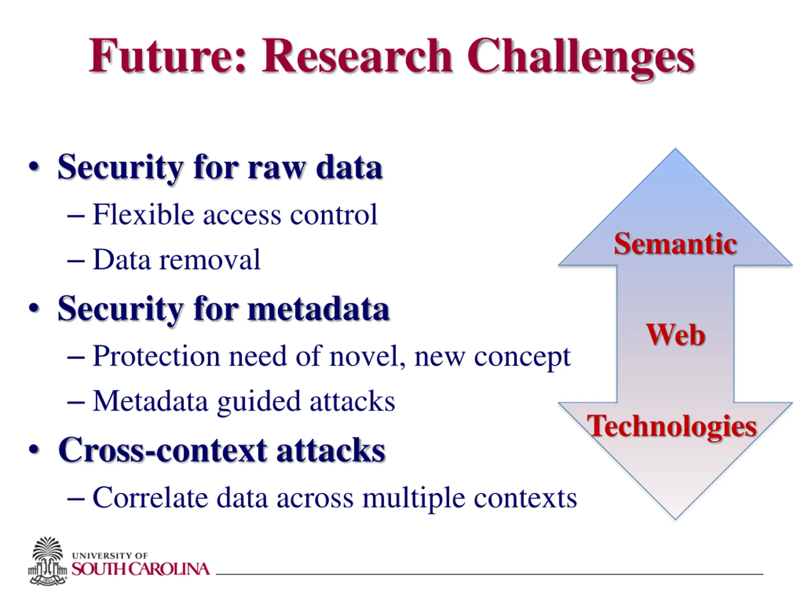 Future: Research Challenges Security for raw data Flexible access control Data removal Security for metadata Protection need of novel, new concept Metadata guided attacks Cross-context attacks Correlate data across multiple contexts Semantic Web Technologies