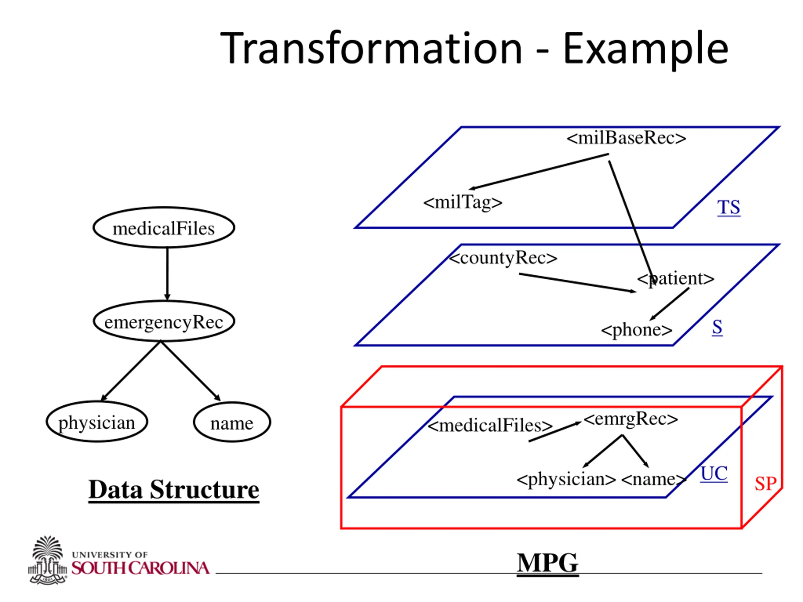 Transformation - Example <milBaseRec> <milTag> TS medicalFiles <countyRec> <patient> emergencyRec S <phone> <emrgRec> physician name <medicalFiles> UC <physician> <name> SP Data Structure MPG