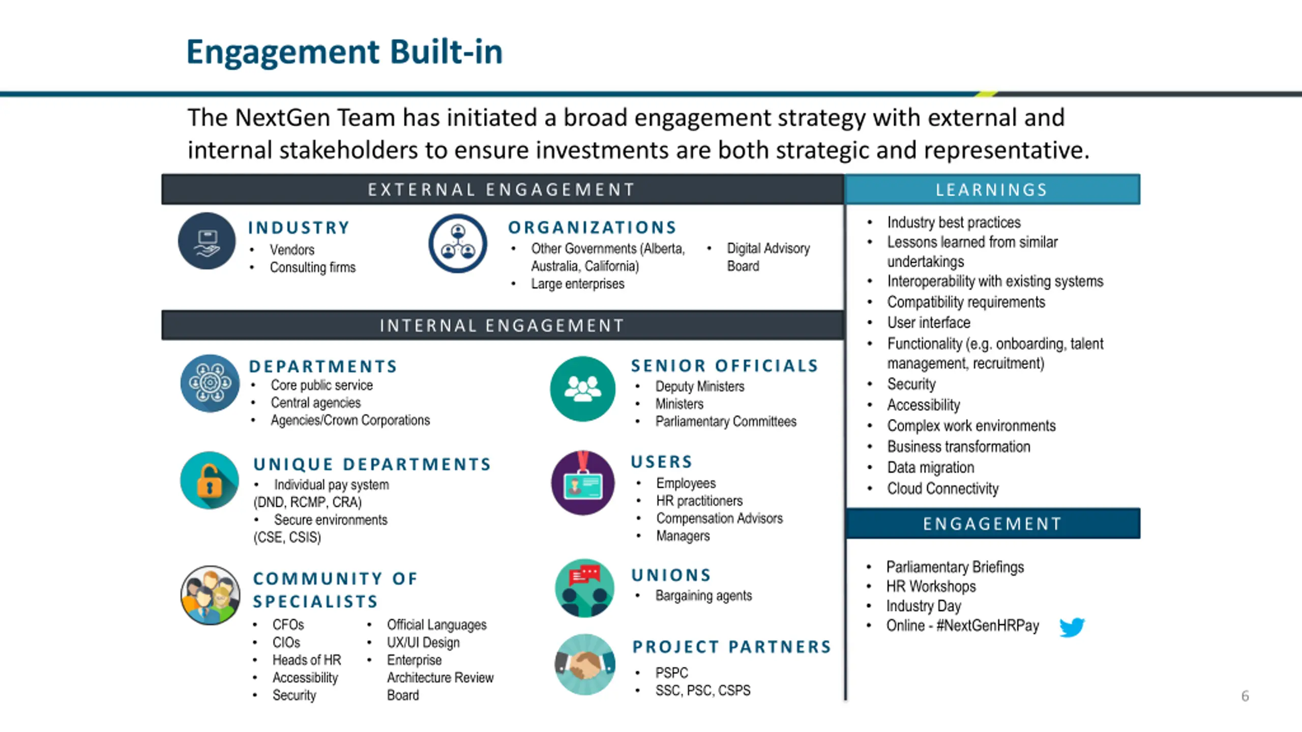 Engagement Built-in The NextGen Team has initiated a broad engagement strategy with external and internal stakeholders to ensure investments are both strategic and representative. E X T E R NA L E N G AG E ME NT LEARNINGS Industry best practices Lessons learned from similar undertakings Interoperability with existing systems Compatibility requirements User interface Functionality (e.g. onboarding, talent management, recruitment) Security Accessibility Complex work environments Business transformation Data migration Cloud Connectivity ORGANIZATIONS Other Governments (Alberta, Australia, California) Large enterprises INDUSTRY Vendors Consulting firms Digital Advisory Board INTERNAL ENGAGEMENT SENIOR OFFICIALS DEPARTMENTS Core public service Central agencies Agencies/Crown Corporations Deputy Ministers Ministers Parliamentary Committees USERS Employees HR practitioners Compensation Advisors Managers UNIQUE DEPARTMENTS Individual pay system (DND, RCMP, CRA) Secure environments (CSE, CSIS) ENGAGEMENT Parliamentary Briefings HR Workshops Industry Day Online - #NextGenHRPay UNIONS Bargaining agents COMMUNITY OF SPECIALISTS CFOs CIOs Heads of HR Accessibility Security Official Languages UX/UI Design Enterprise Architecture Review Board PROJECT PARTNERS PSPC SSC, PSC, CSPS 6