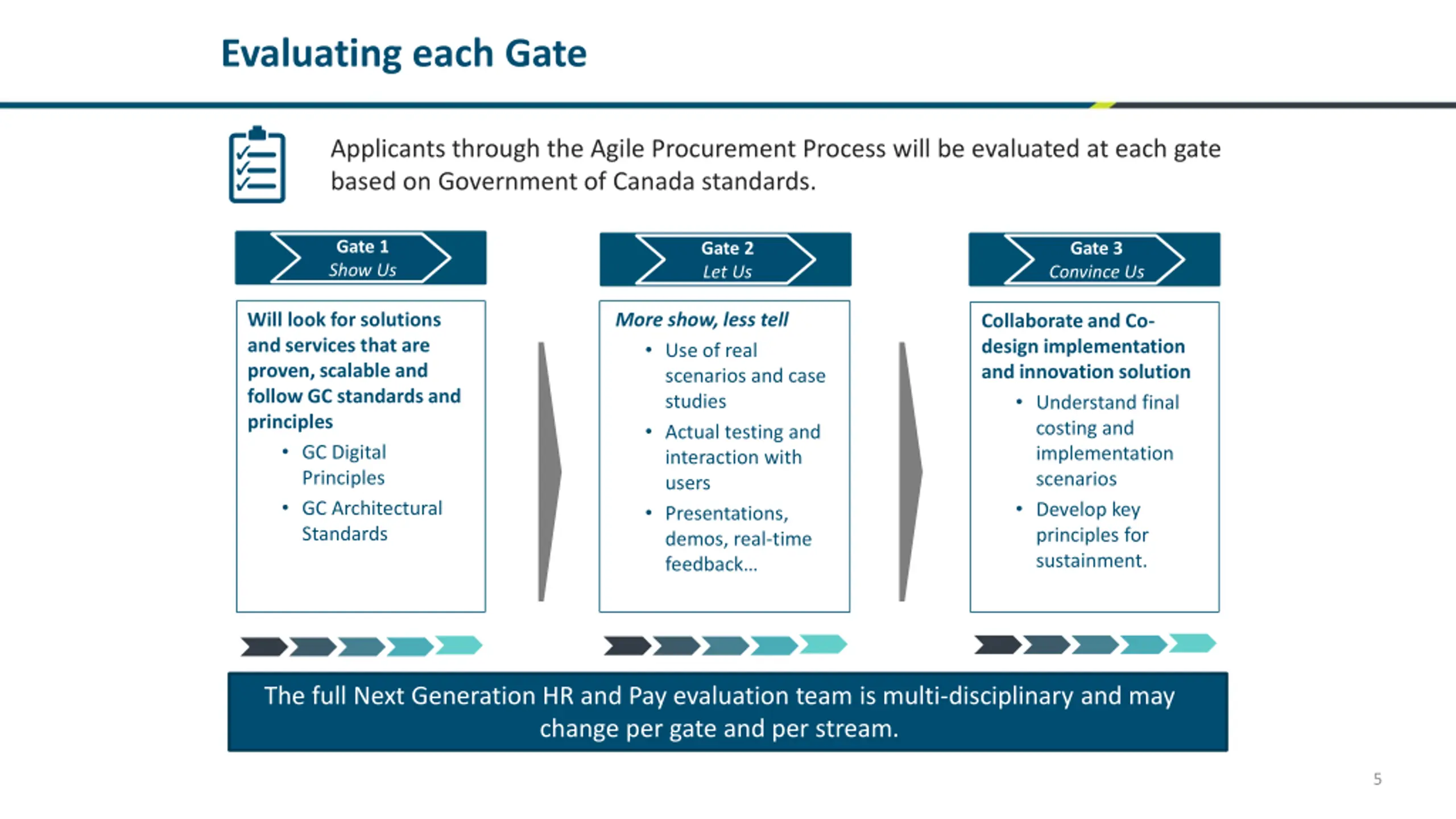 Working through a Gated Approach Launched October 1 Launched November 23 Launching 2019 Initial Planning Outputs Spring 2019 Viable market solution(s) HR Transformation Engagement with users and vendors Recommended options Gate One Show Us Gate Two Let Us Gate Three Convince Us Launch of Gate One Decrease in number of Qualified Vendors 4