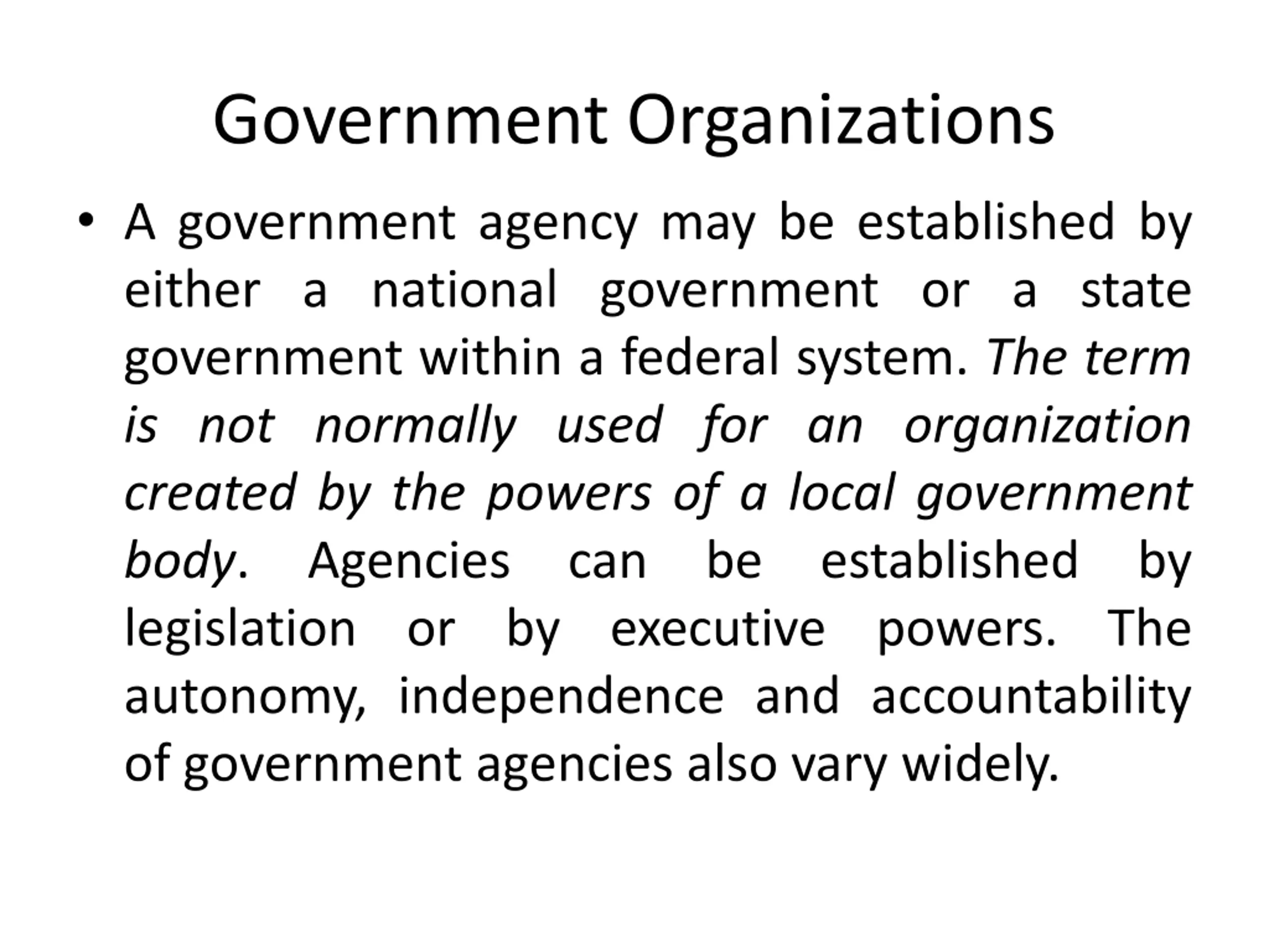 Government Organizations A government agency may be established by either a national government or a state government within a federal system. The term is not normally used for an organization created by the powers of a local government body. Agencies can legislation or by executive powers. The autonomy, independence and accountability of government agencies also vary widely. be established by