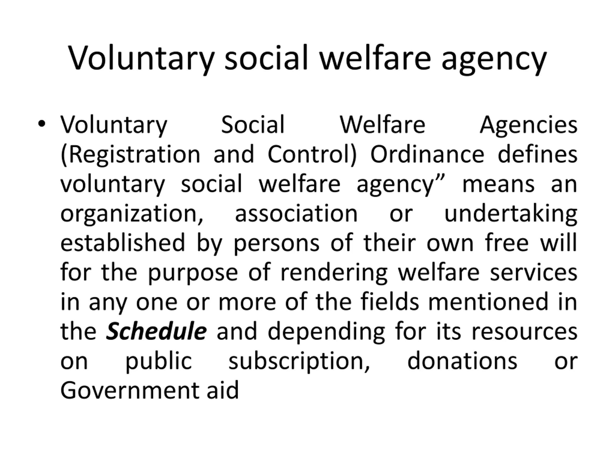 Voluntary social welfare agency Voluntary (Registration and Control) Ordinance defines voluntary social welfare agency means an organization, association established by persons of their own free will for the purpose of rendering welfare services in any one or more of the fields mentioned in the Schedule and depending for its resources on public subscription, Government aid Social Welfare Agencies or undertaking donations or