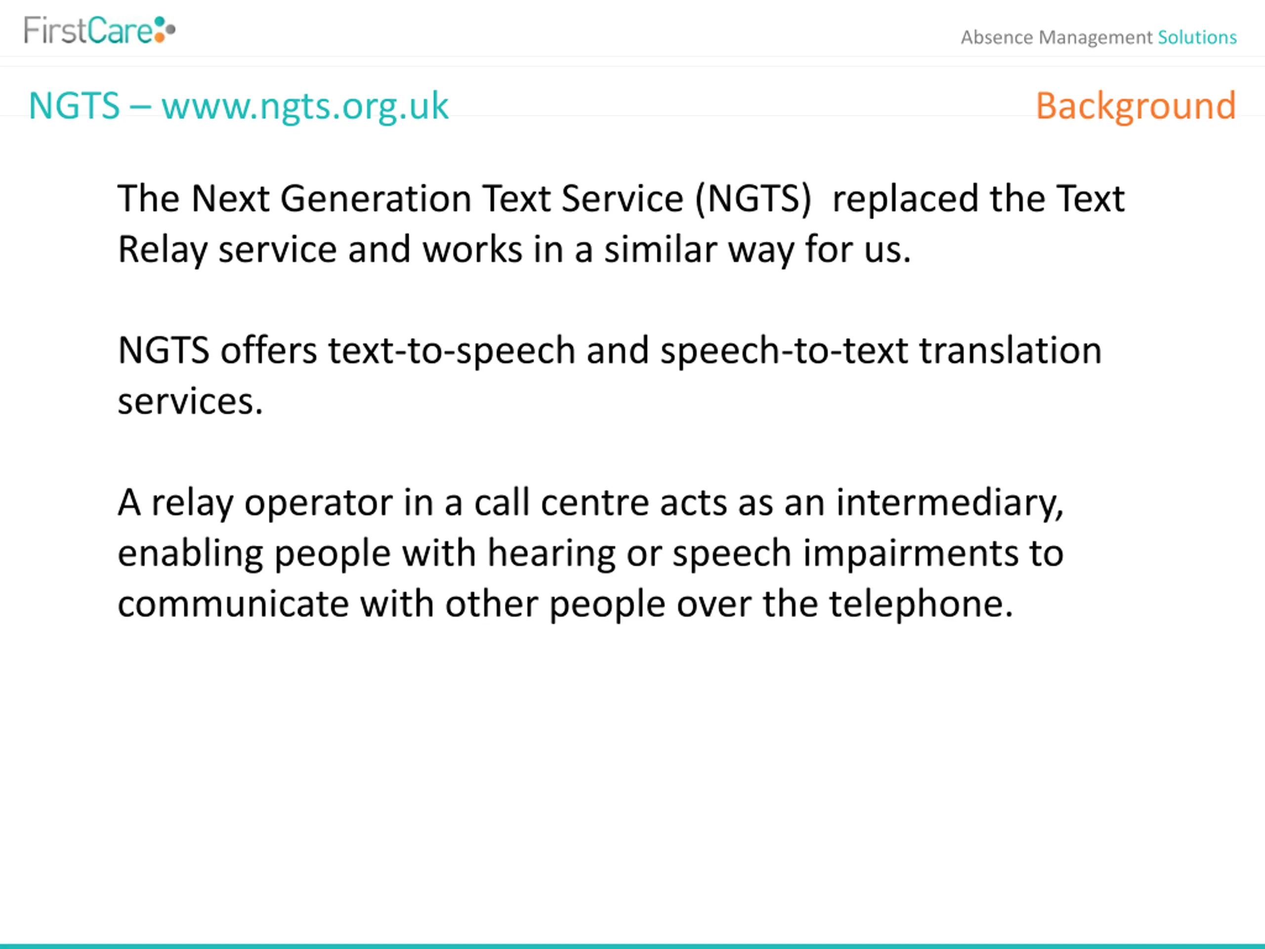 Absence Management Solutions NGTS www.ngts.org.uk Background The Next Generation Text Service (NGTS) replaced the Text Relay service and works in a similar way for us. NGTS offers text-to-speech and speech-to-text translation services. A relay operator in a call centre acts as an intermediary, enabling people with hearing or speech impairments to communicate with other people over the telephone.