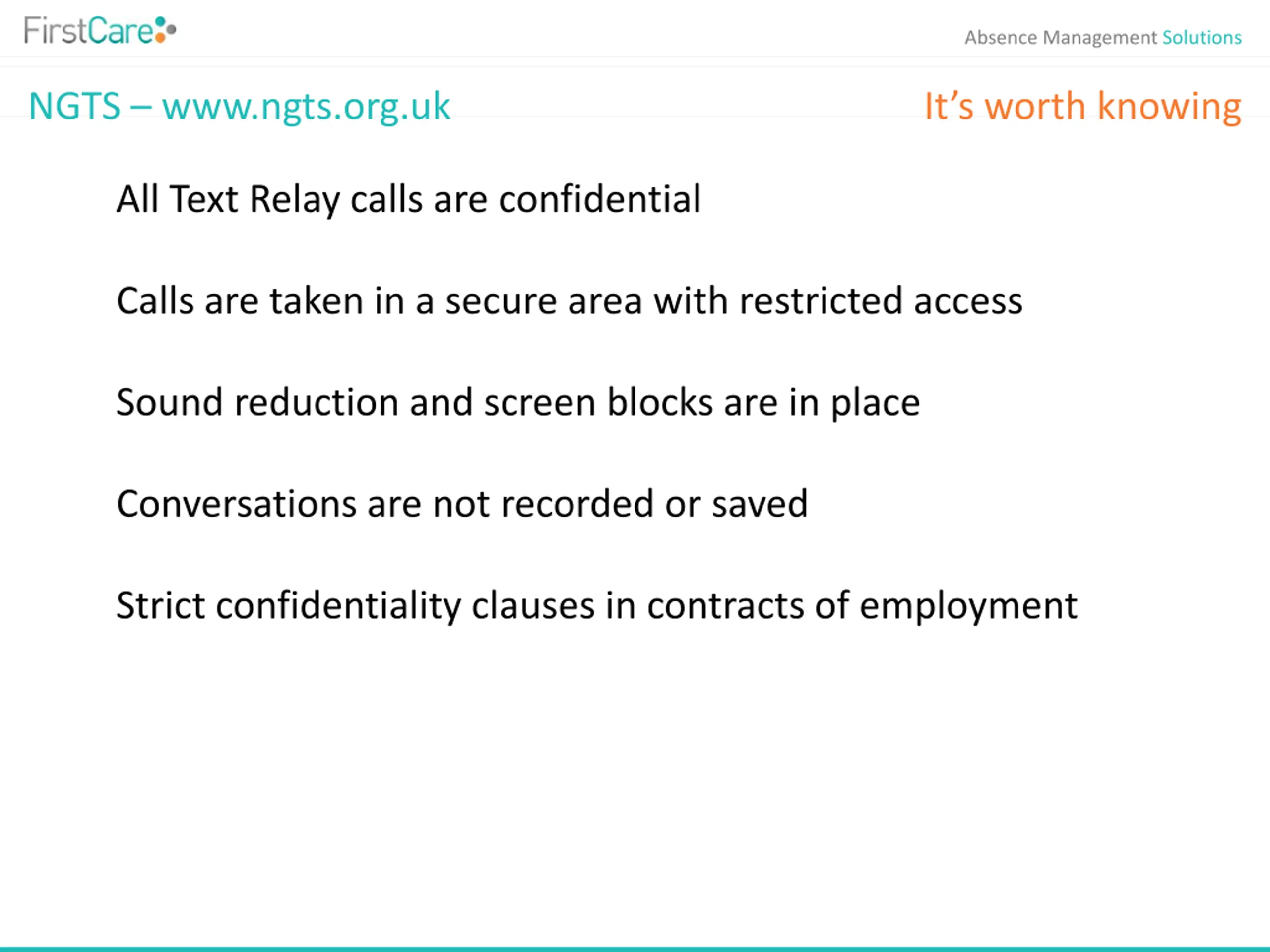 Absence Management Solutions NGTS www.ngts.org.uk It s worth knowing All Text Relay calls are confidential Calls are taken in a secure area with restricted access Sound reduction and screen blocks are in place Conversations are not recorded or saved Strict confidentiality clauses in contracts of employment