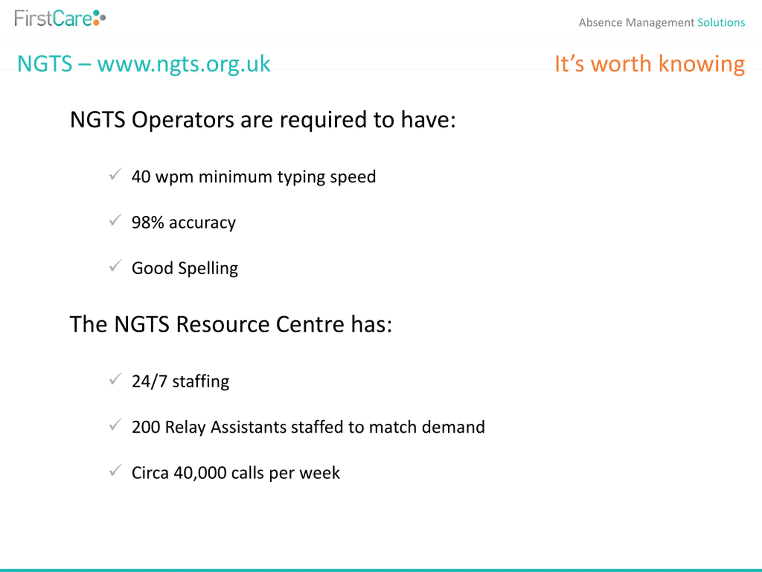 Absence Management Solutions NGTS www.ngts.org.uk It s worth knowing NGTS Operators are required to have: 40 wpm minimum typing speed 98% accuracy Good Spelling The NGTS Resource Centre has: 24/7 staffing 200 Relay Assistants staffed to match demand Circa 40,000 calls per week