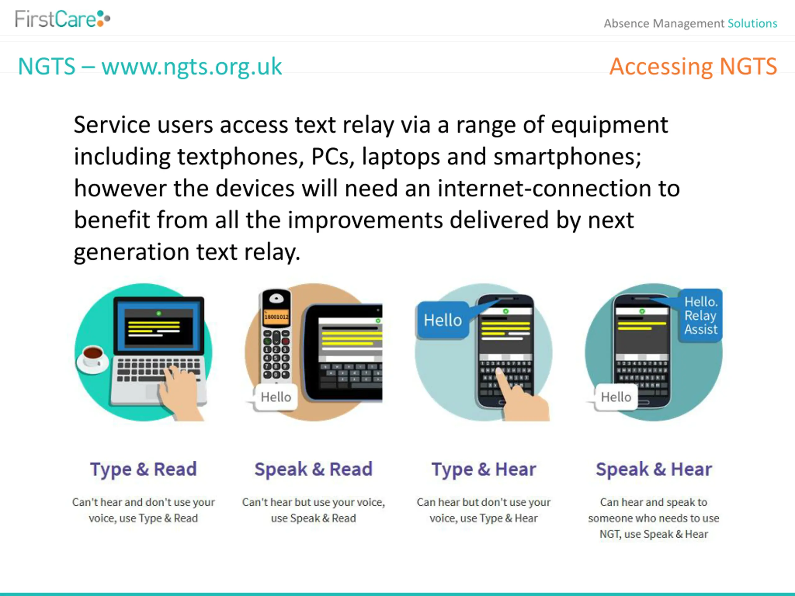 Absence Management Solutions NGTS www.ngts.org.uk Accessing NGTS Service users access text relay via a range of equipment including textphones, PCs, laptops and smartphones; however the devices will need an internet-connection to benefit from all the improvements delivered by next generation text relay.