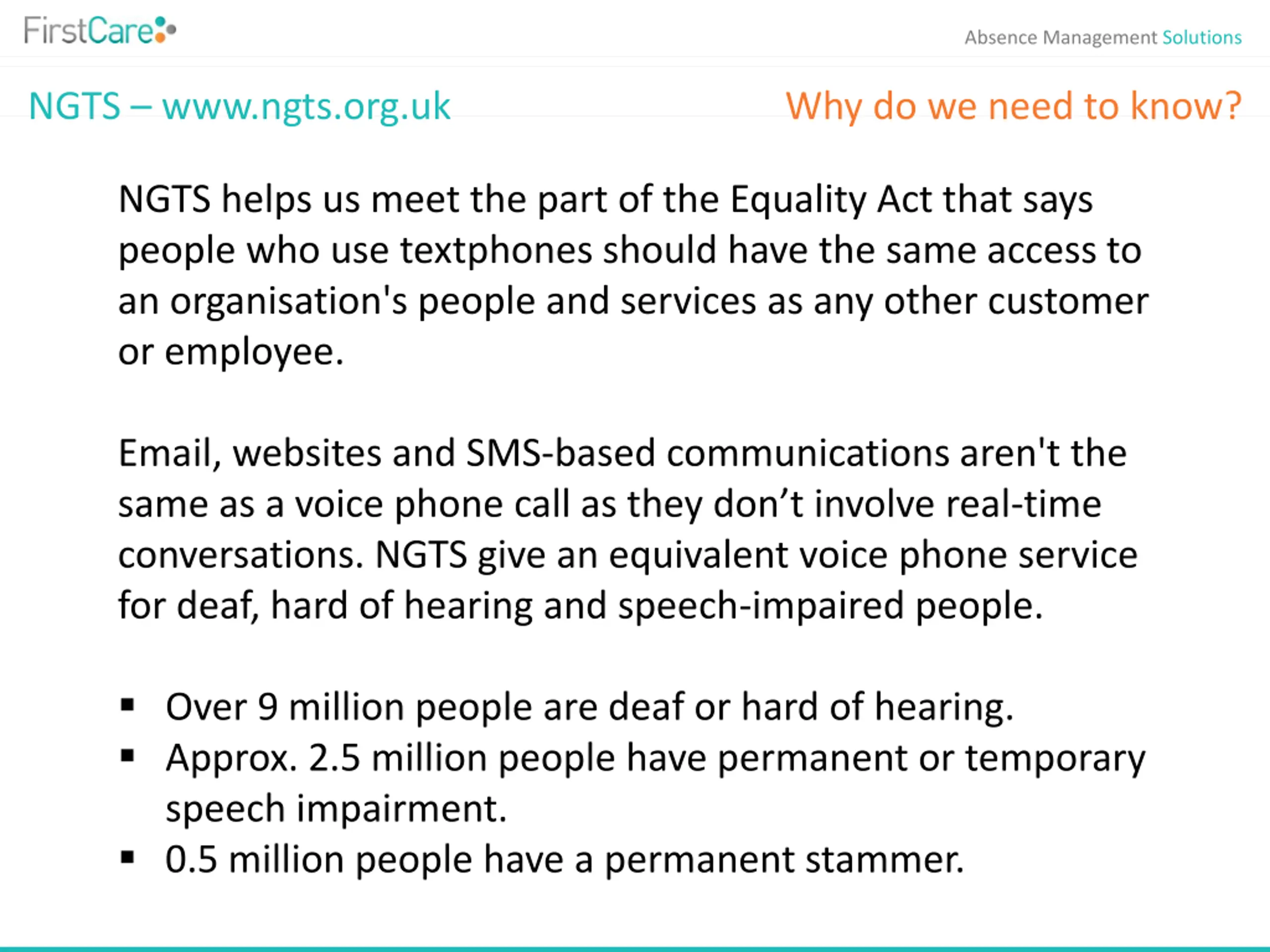 Absence Management Solutions NGTS www.ngts.org.uk Why do we need to know? NGTS helps us meet the part of the Equality Act that says people who use textphones should have the same access to an organisation's people and services as any other customer or employee. Email, websites and SMS-based communications aren't the same as a voice phone call as they don t involve real-time conversations. NGTS give an equivalent voice phone service for deaf, hard of hearing and speech-impaired people. Over 9 million people are deaf or hard of hearing. Approx. 2.5 million people have permanent or temporary speech impairment. 0.5 million people have a permanent stammer.