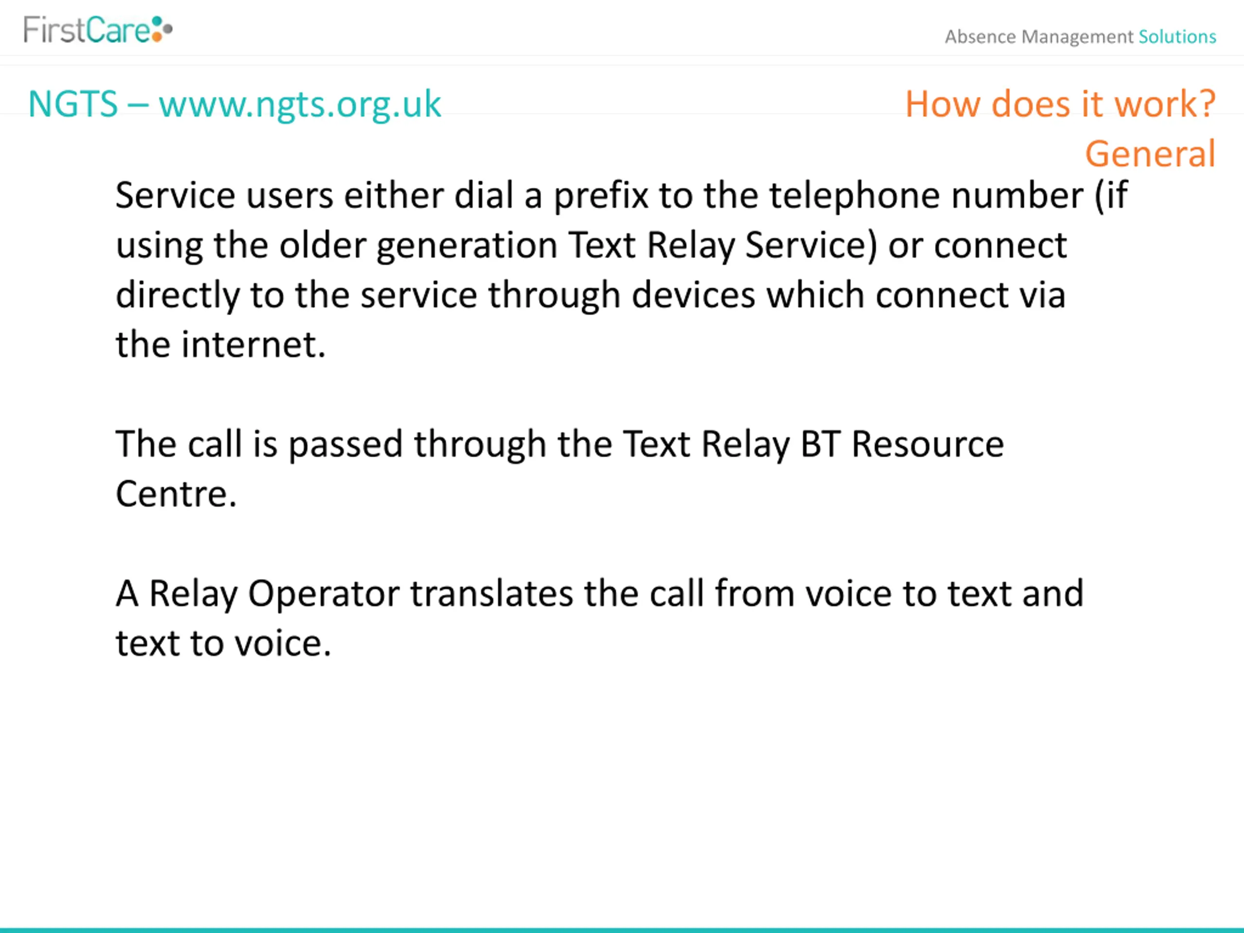 Absence Management Solutions NGTS www.ngts.org.uk How does it work? General Service users either dial a prefix to the telephone number (if using the older generation Text Relay Service) or connect directly to the service through devices which connect via the internet. The call is passed through the Text Relay BT Resource Centre. A Relay Operator translates the call from voice to text and text to voice.