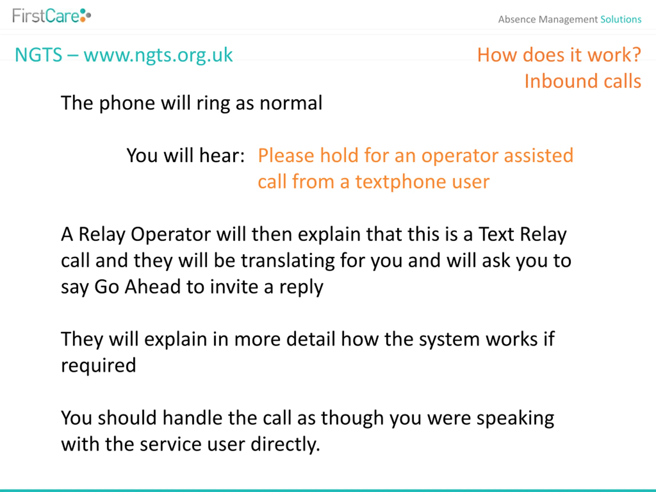 Absence Management Solutions NGTS www.ngts.org.uk How does it work? Inbound calls The phone will ring as normal You will hear: Please hold for an operator assisted call from a textphone user A Relay Operator will then explain that this is a Text Relay call and they will be translating for you and will ask you to say Go Ahead to invite a reply They will explain in more detail how the system works if required You should handle the call as though you were speaking with the service user directly.