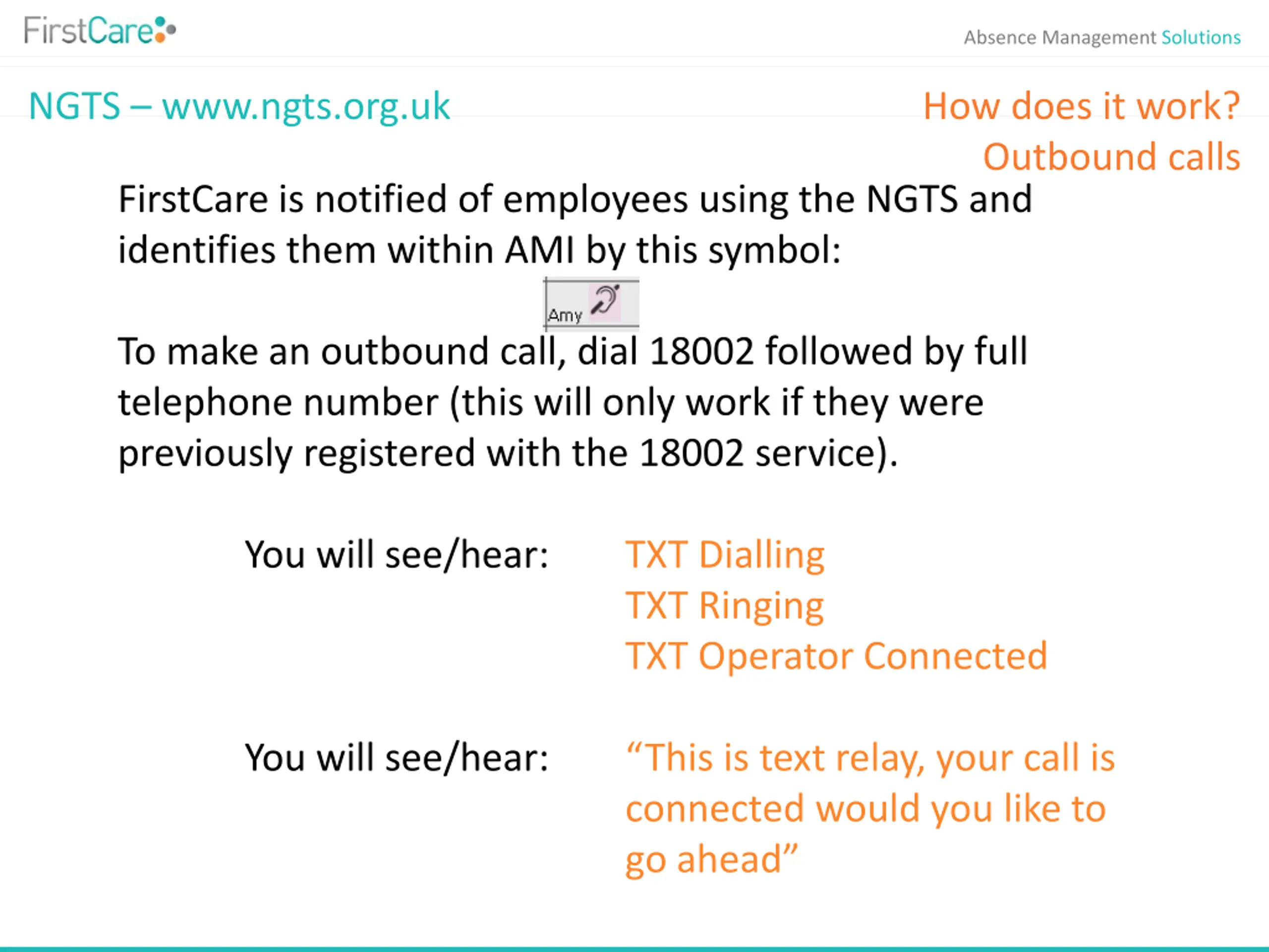 Absence Management Solutions NGTS www.ngts.org.uk How does it work? Outbound calls FirstCare is notified of employees using the NGTS and identifies them within AMI by this symbol: To make an outbound call, dial 18002 followed by full telephone number (this will only work if they were previously registered with the 18002 service). You will see/hear: TXT Dialling TXT Ringing TXT Operator Connected You will see/hear: This is text relay, your call is connected would you like to go ahead