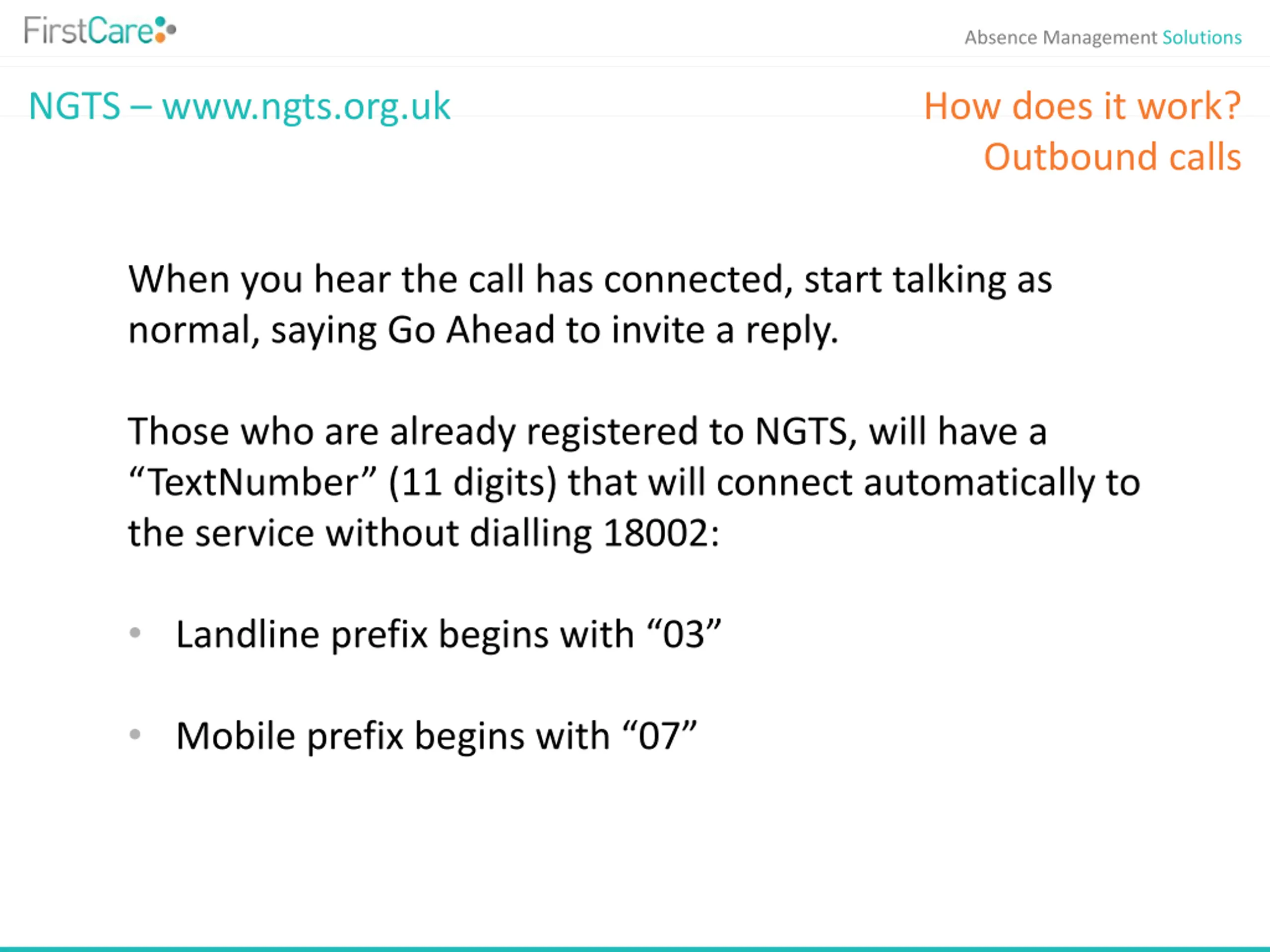 Absence Management Solutions NGTS www.ngts.org.uk How does it work? Outbound calls When you hear the call has connected, start talking as normal, saying Go Ahead to invite a reply. Those who are already registered to NGTS, will have a TextNumber (11 digits) that will connect automatically to the service without dialling 18002: Landline prefix begins with 03 Mobile prefix begins with 07