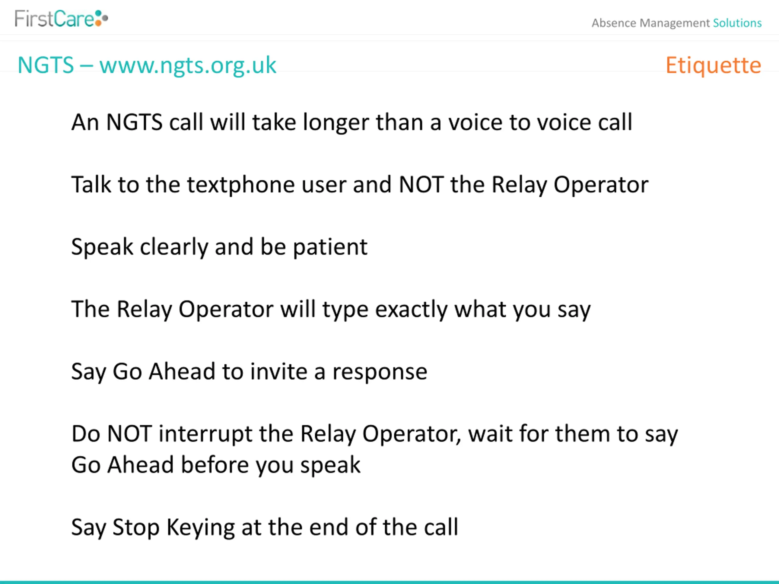 Absence Management Solutions NGTS www.ngts.org.uk Etiquette An NGTS call will take longer than a voice to voice call Talk to the textphone user and NOT the Relay Operator Speak clearly and be patient The Relay Operator will type exactly what you say Say Go Ahead to invite a response Do NOT interrupt the Relay Operator, wait for them to say Go Ahead before you speak Say Stop Keying at the end of the call