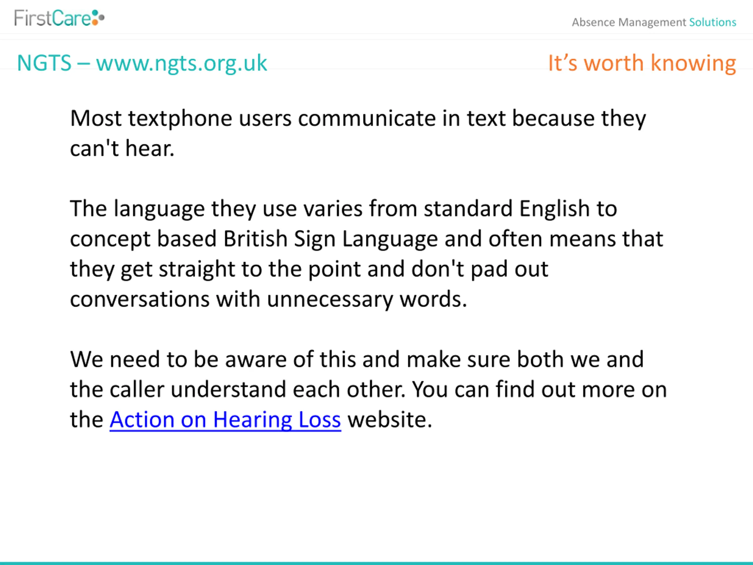 Absence Management Solutions NGTS www.ngts.org.uk It s worth knowing Most textphone users communicate in text because they can't hear. The language they use varies from standard English to concept based British Sign Language and often means that they get straight to the point and don't pad out conversations with unnecessary words. We need to be aware of this and make sure both we and the caller understand each other. You can find out more on the Action on Hearing Loss website.