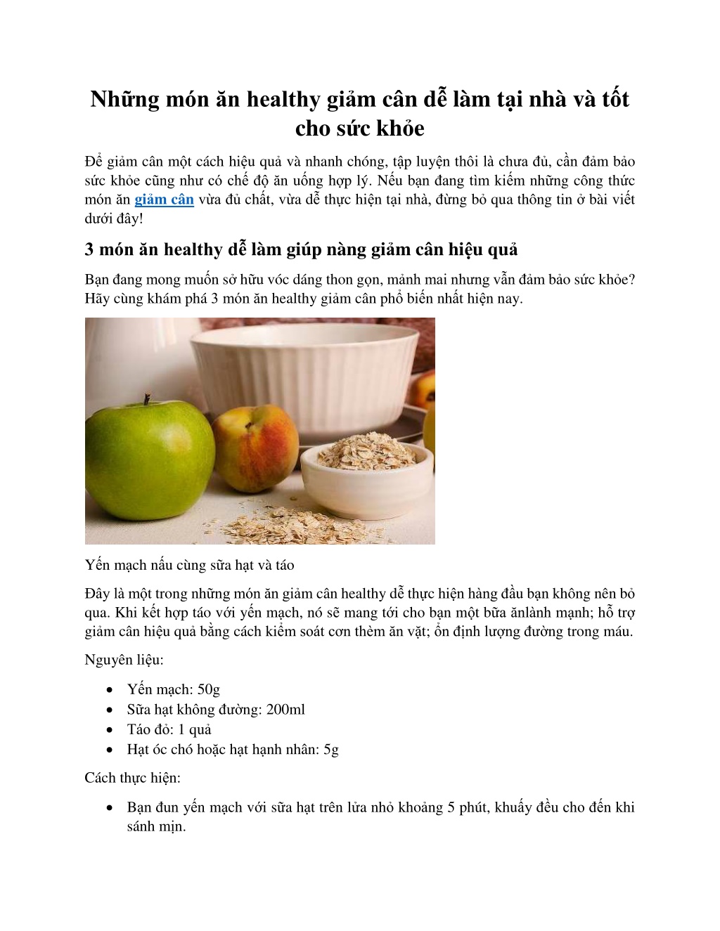 Nhng mn n healthy gim cn d lm ti nh v tt cho s c kh e gi m c n m t c ch hi u qu v nhanh ch ng, t p luy n th i l ch a , c n m b o s c kh e c ng nh c ch n u ng h p l . N u b n ang t m ki m nh ng c ng th c m n n gi m c n v a ch t, v a d th c hi n t i nh , ng b qua th ng tin b i vi t d i y! 3 m n n healthy d l m gi p n ng gi m c n hi u qu B n ang mong mu n s h u v c d ng thon g n, m nh mai nh ng v n m b o s c kh e? H y c ng kh m ph 3 m n n healthy gi m c n ph bi n nh t hi n nay. Y n m ch n u c ng s a h t v t o y l m t trong nh ng m n n gi m c n healthy d th c hi n h ng u b n kh ng n n b qua. Khi k t h p t o v i y n m ch, n s mang t i cho b n m t b a nl nh m nh; h tr gi m c n hi u qu b ng c ch ki m so t c n th m n v t; n nh l ng ng trong m u. Nguy n li u: Y n m ch: 50g S a h t kh ng ng: 200ml T o : 1 qu H t c ch ho c h t h nh nh n: 5g C ch th c hi n: B n un y n m ch v i s a h t tr n l a nh kho ng 5 ph t, khu y u cho n khi s nh m n.
