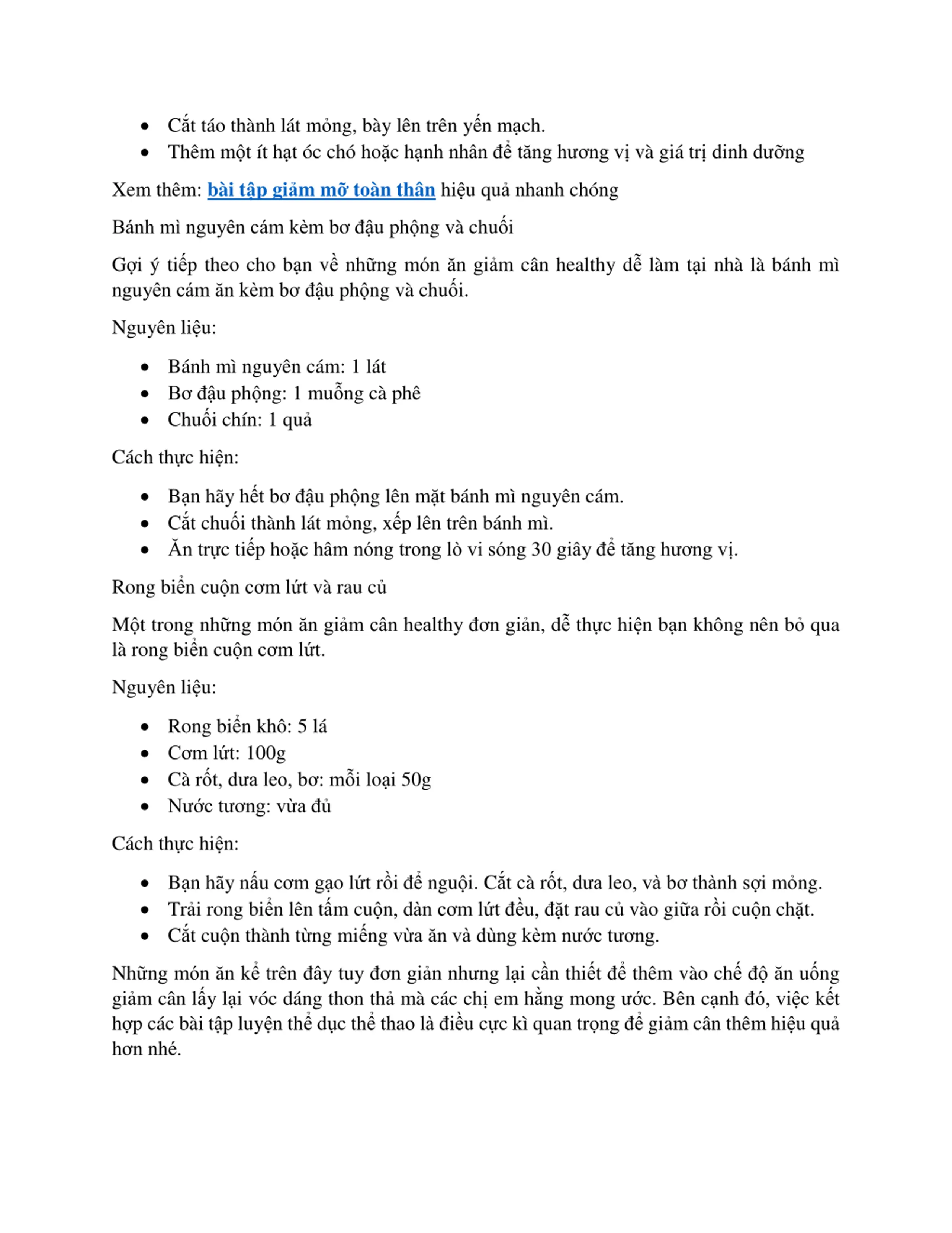 Ct to thnh lt mng, by ln trn yn mch. Th m m t t h t c ch ho c h nh nh n t ng h ng v v gi tr dinh d ng Xem th m: b i t p gi m m to n th n hi u qu nhanh ch ng B nh m nguy n c m k m b u ph ng v chu i G i ti p theo cho b n v nh ng m n n gi m c n healthy d l m t i nh l b nh m nguy n c m n k m b u ph ng v chu i. Nguy n li u: B nh m nguy n c m: 1 l t B u ph ng: 1 mu ng c ph Chu i ch n: 1 qu C ch th c hi n: B n h y h t b u ph ng l n m t b nh m nguy n c m. C t chu i th nh l t m ng, x p l n tr n b nh m . n tr c ti p ho c h m n ng trong l vi s ng 30 gi y t ng h ng v . Rong bi n cu n c m l t v rau c M t trong nh ng m n n gi m c n healthy n gi n, d th c hi n b n kh ng n n b qua l rong bi n cu n c m l t. Nguy n li u: Rong bi n kh : 5 l C m l t: 100g C r t, d a leo, b : m i lo i 50g N c t ng: v a C ch th c hi n: B n h y n u c m g o l t r i ngu i. C t c r t, d a leo, v b th nh s i m ng. Tr i rong bi n l n t m cu n, d n c m l t u, t rau c v o gi a r i cu n ch t. C t cu n th nh t ng mi ng v a n v d ng k m n c t ng. Nh ng m n n k tr n y tuy n gi n nh ng l i c n thi t th m v o ch n u ng gi m c n l y l i v c d ng thon th m c c ch em h ng mong c. B n c nh , vi c k t h p c c b i t p luy n th d c th thao l i u c c k quan tr ng gi m c n th m hi u qu h n nh .
