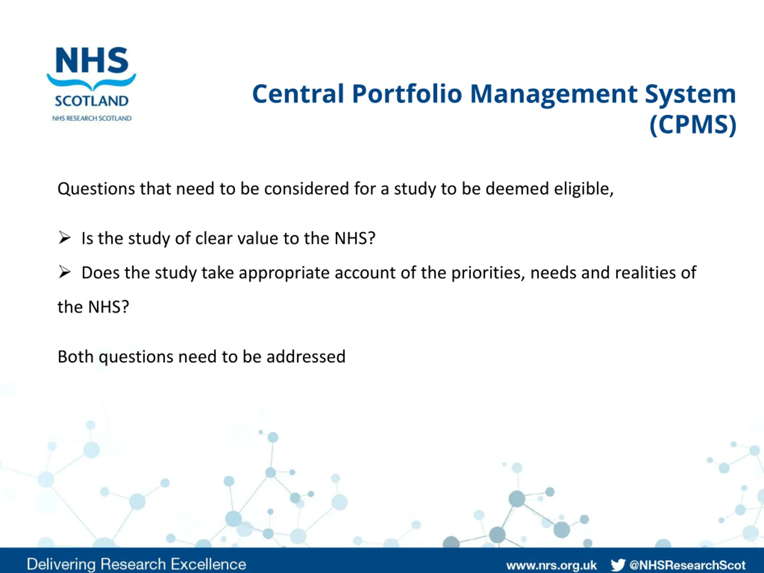 Central Portfolio Management System (CPMS) Questions that need to be considered for a study to be deemed eligible, Is the study of clear value to the NHS? Does the study take appropriate account of the priorities, needs and realities of the NHS? Both questions need to be addressed