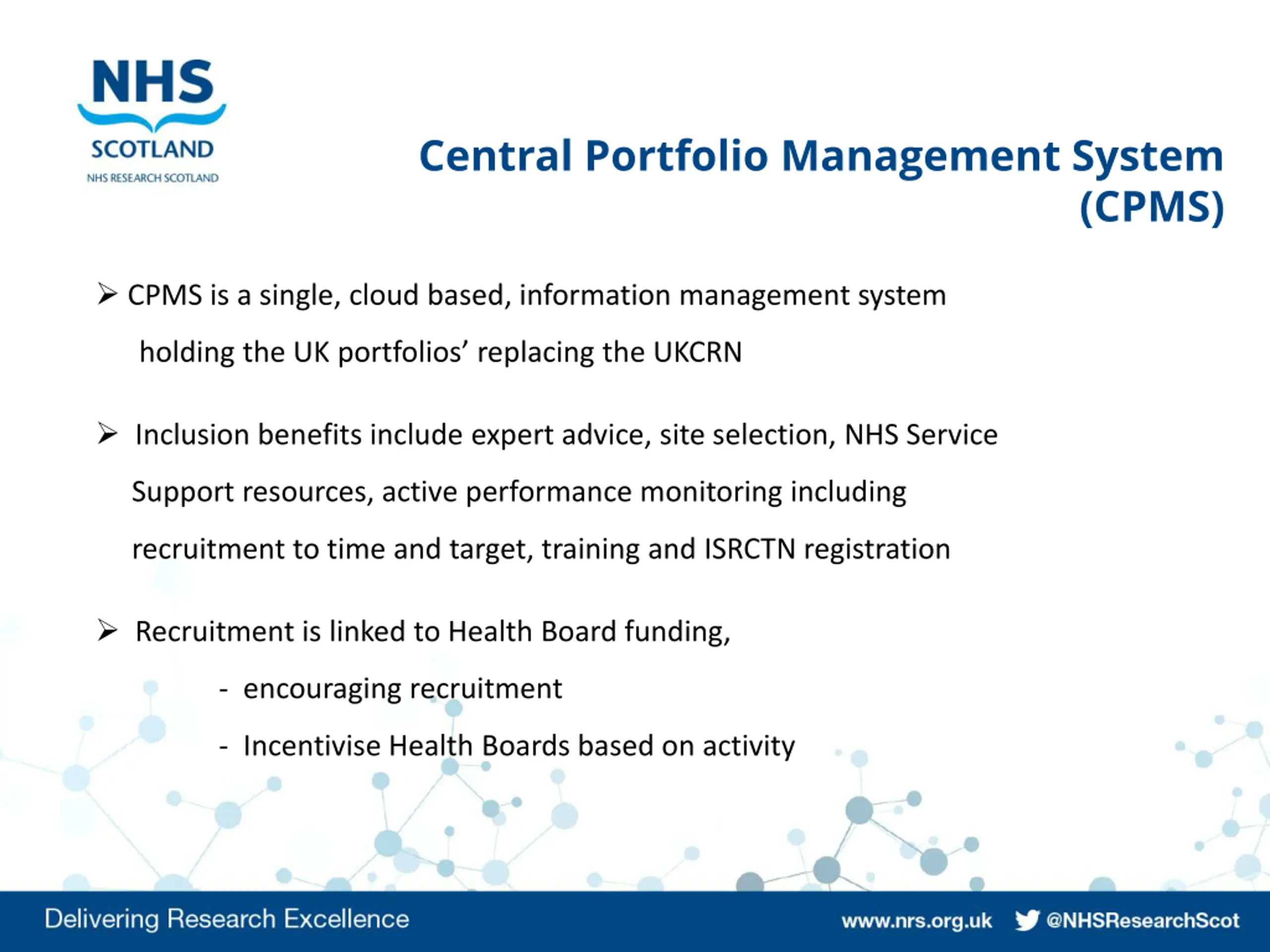 Central Portfolio Management System (CPMS) CPMS is a single, cloud based, information management system holding the UK portfolios replacing the UKCRN Inclusion benefits include expert advice, site selection, NHS Service Support resources, active performance monitoring including recruitment to time and target, training and ISRCTN registration Recruitment is linked to Health Board funding, - encouraging recruitment - Incentivise Health Boards based on activity