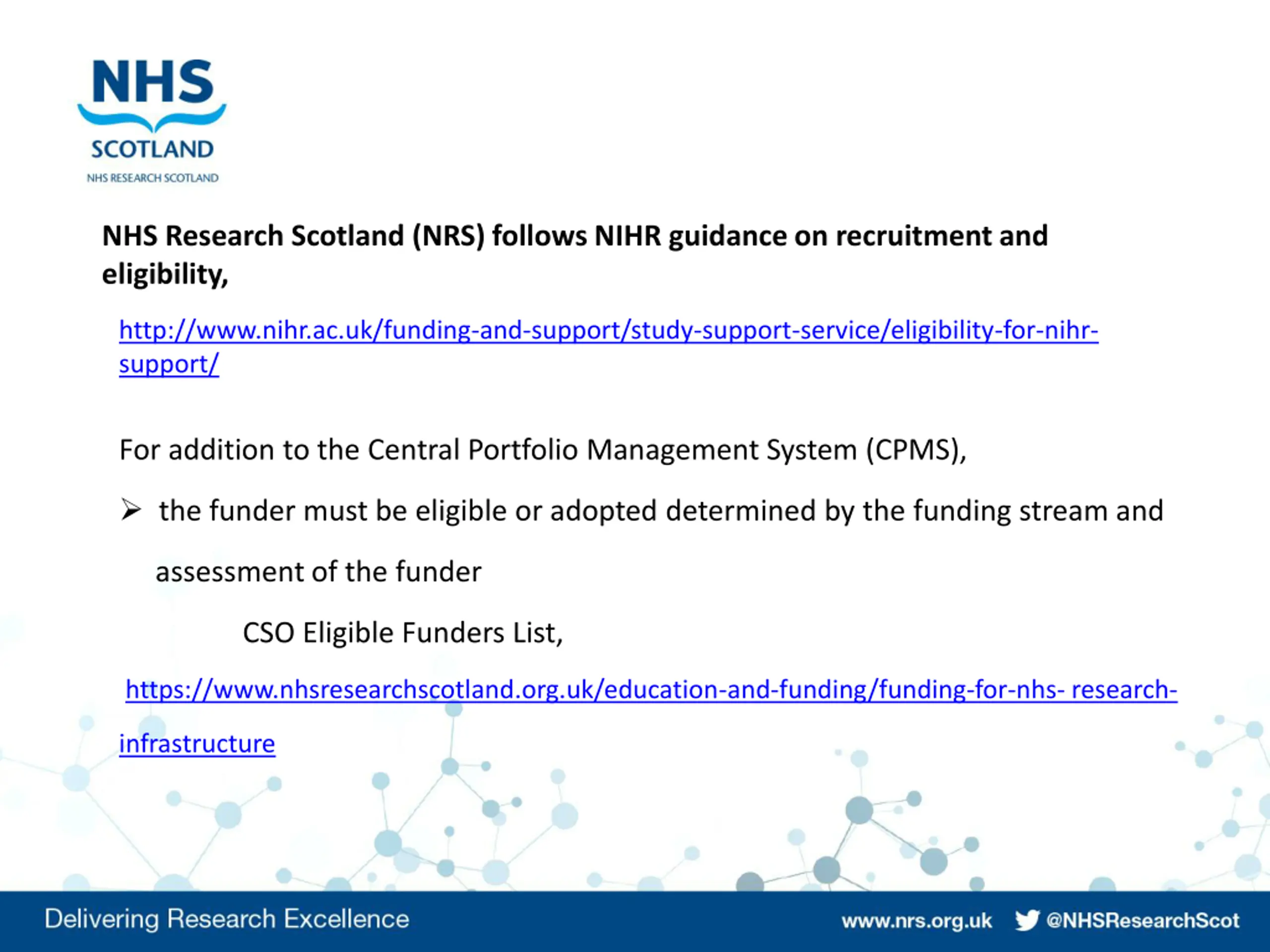 NHS Research Scotland (NRS) follows NIHR guidance on recruitment and eligibility, http://www.nihr.ac.uk/funding-and-support/study-support-service/eligibility-for-nihr- support/ For addition to the Central Portfolio Management System (CPMS), the funder must be eligible or adopted determined by the funding stream and assessment of the funder CSO Eligible Funders List, https://www.nhsresearchscotland.org.uk/education-and-funding/funding-for-nhs- research- infrastructure