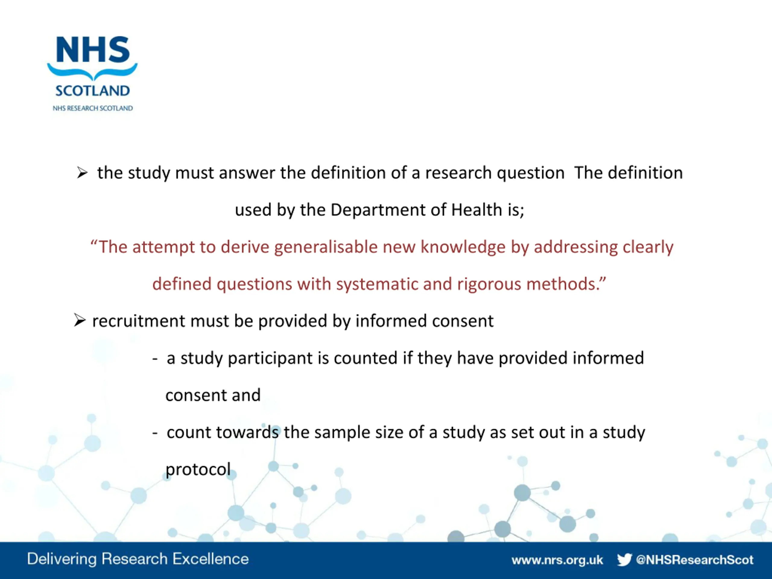 the study must answer the definition of a research question The definition used by the Department of Health is; The attempt to derive generalisable new knowledge by addressing clearly defined questions with systematic and rigorous methods. recruitment must be provided by informed consent - a study participant is counted if they have provided informed consent and - count towards the sample size of a study as set out in a study protocol