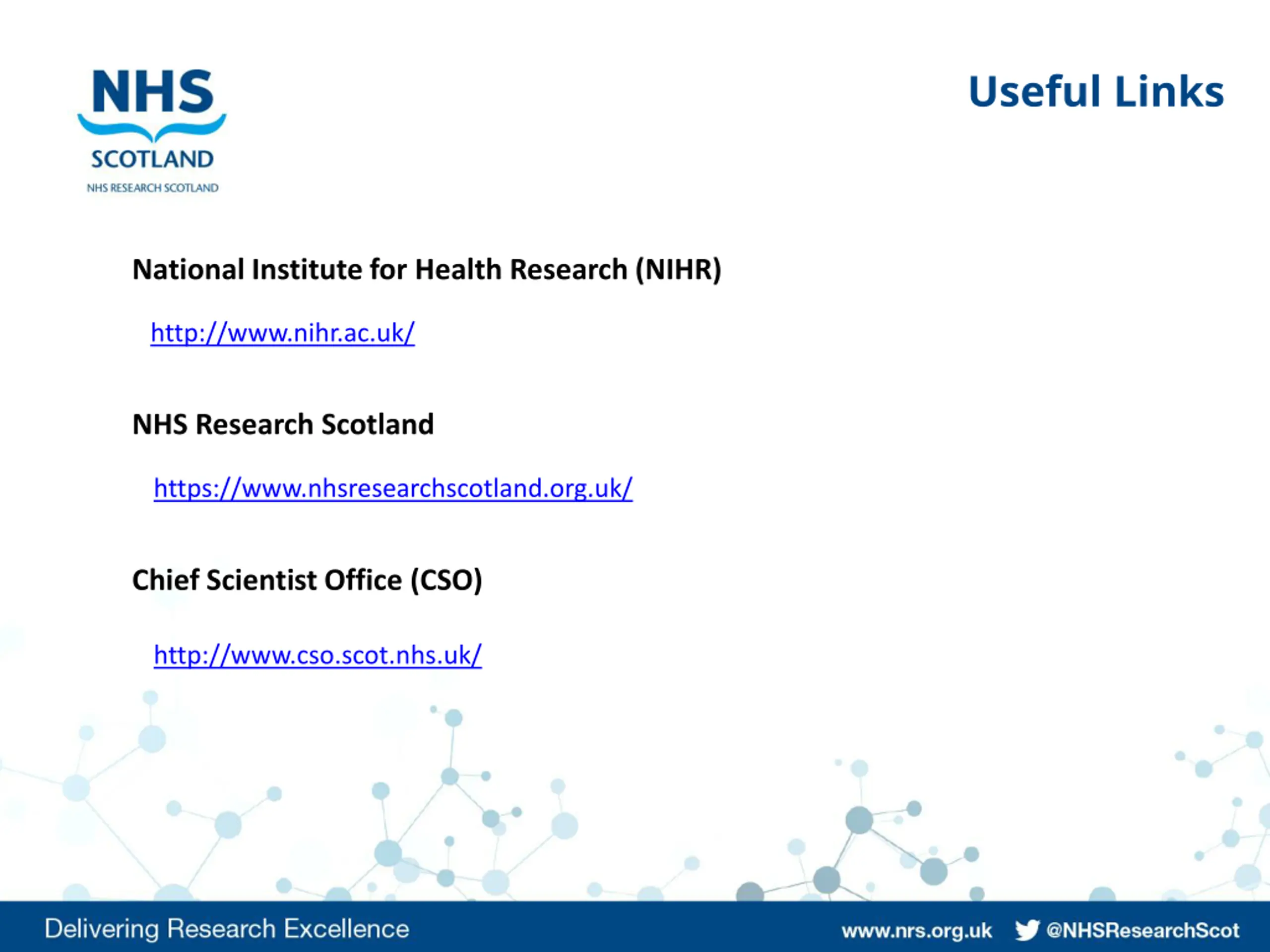 Useful Links National Institute for Health Research (NIHR) http://www.nihr.ac.uk/ NHS Research Scotland https://www.nhsresearchscotland.org.uk/ Chief Scientist Office (CSO) http://www.cso.scot.nhs.uk/