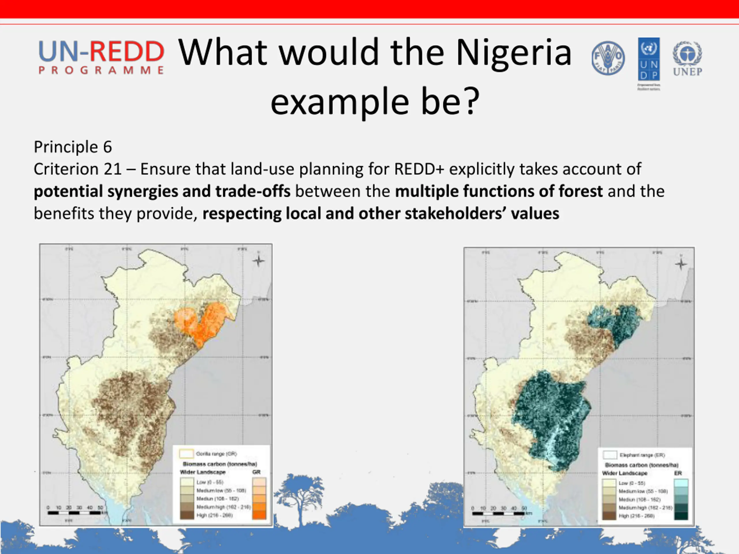 What would the Nigeria example be? Principle 6 Criterion 21 Ensure that land-use planning for REDD+ explicitly takes account of potential synergies and trade-offs between the multiple functions of forest and the benefits they provide, respecting local and other stakeholders values