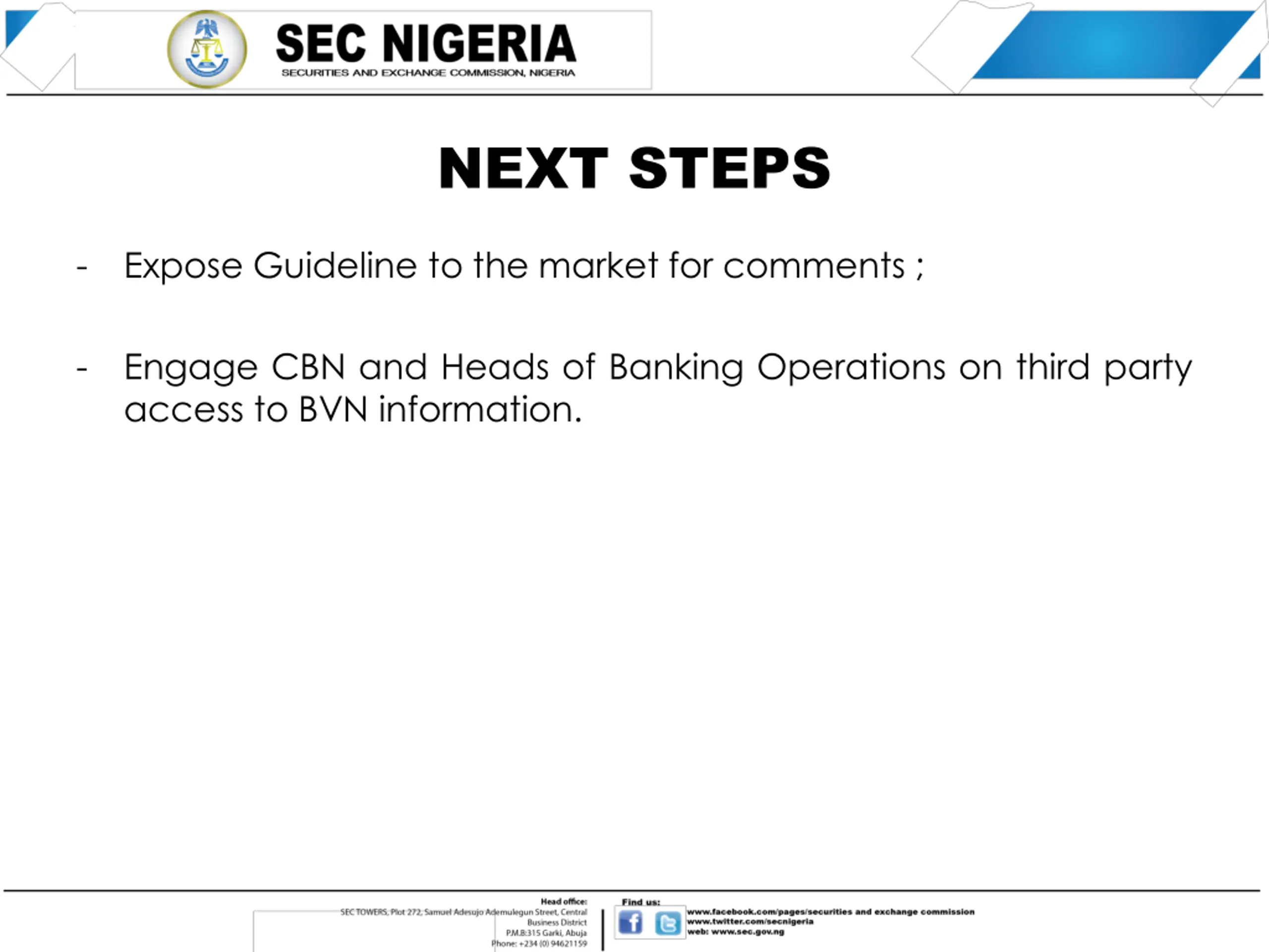 NEXT STEPS - Expose Guideline to the market for comments ; - Engage CBN and Heads of Banking Operations on third party access to BVN information.