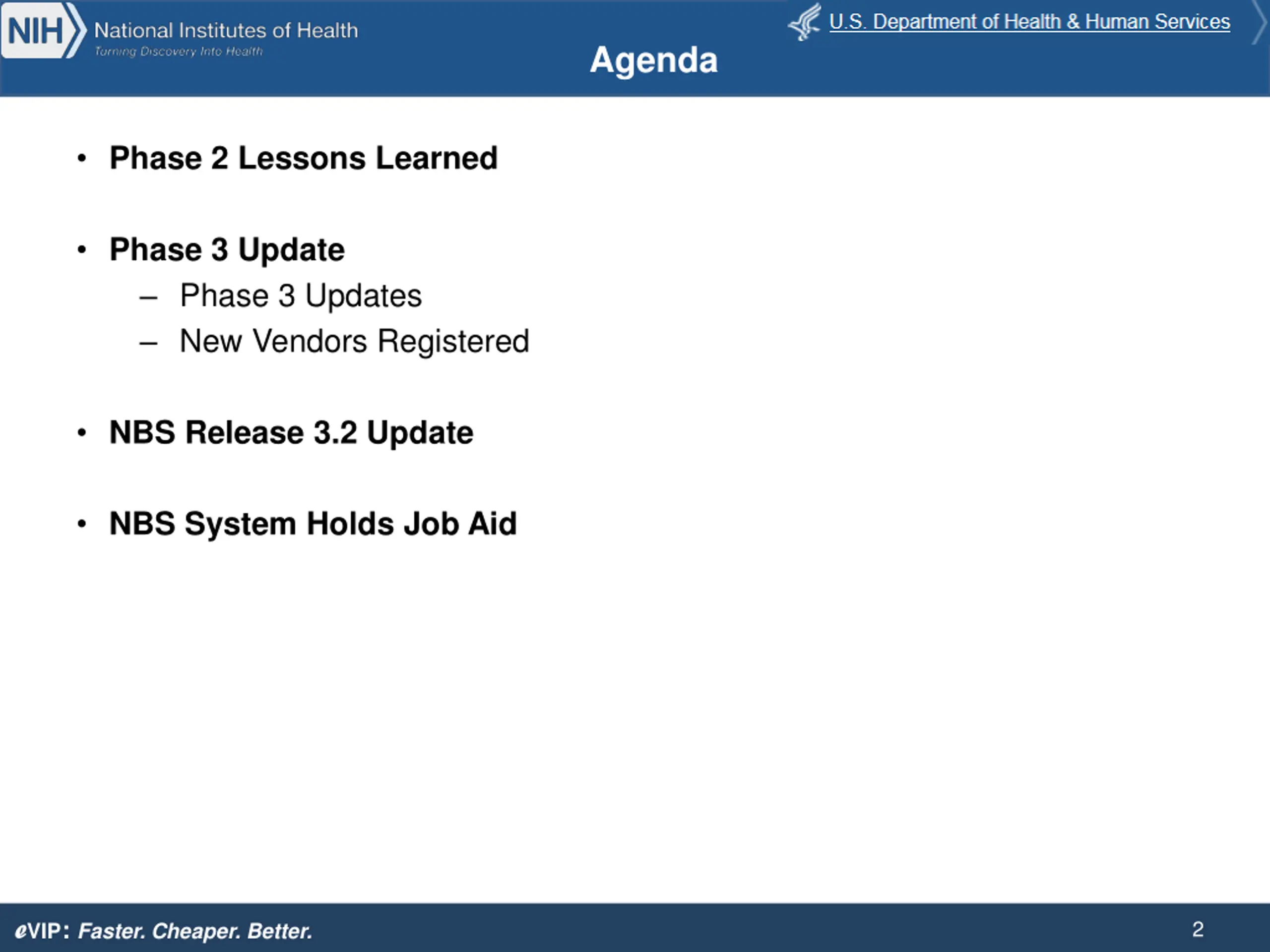 National Institutes of Health (NIH) - Turning Discovery Into Health Agenda Phase 2 Lessons Learned Phase 3 Update Phase 3 Updates New Vendors Registered NBS Release 3.2 Update NBS System Holds Job Aid eVIP: Faster. Cheaper. Better. 2