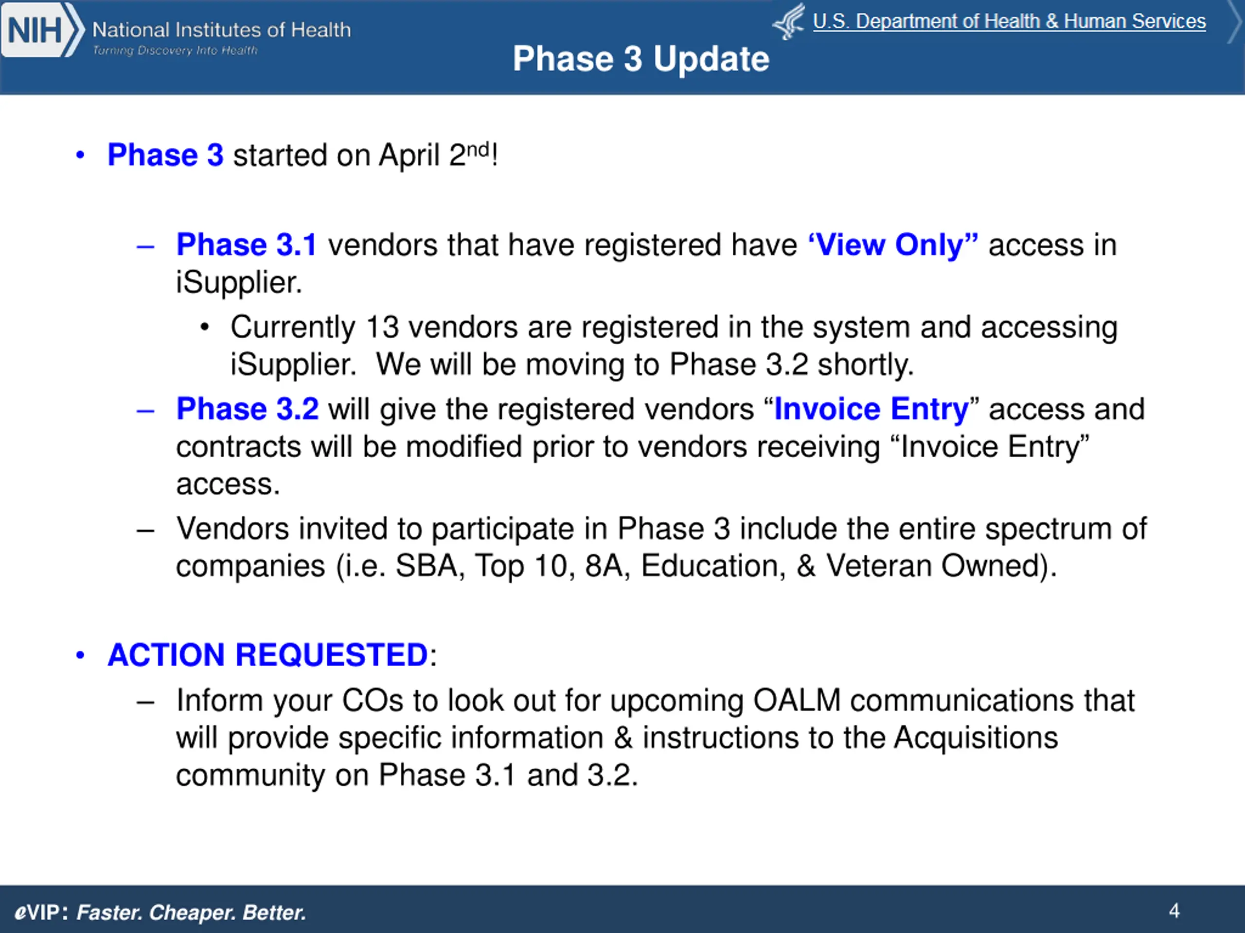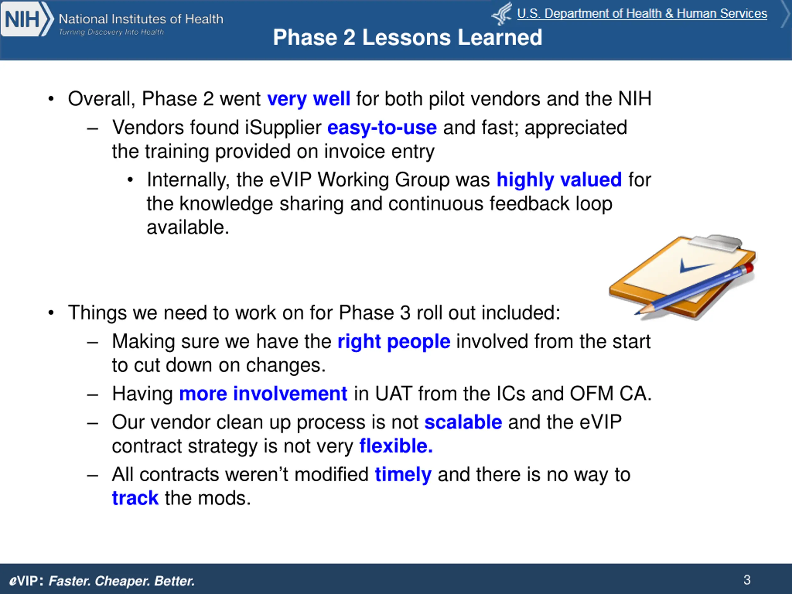 National Institutes of Health (NIH) - Turning Discovery Into Health Phase 2 Lessons Learned Overall, Phase 2 went very well for both pilot vendors and the NIH Vendors found iSupplier easy-to-use and fast; appreciated the training provided on invoice entry Internally, the eVIP Working Group was highly valued for the knowledge sharing and continuous feedback loop available. Things we need to work on for Phase 3 roll out included: Making sure we have the right people involved from the start to cut down on changes. Having more involvement in UAT from the ICs and OFM CA. Our vendor clean up process is not scalable and the eVIP contract strategy is not very flexible. All contracts weren t modified timely and there is no way to track the mods. eVIP: Faster. Cheaper. Better. 3