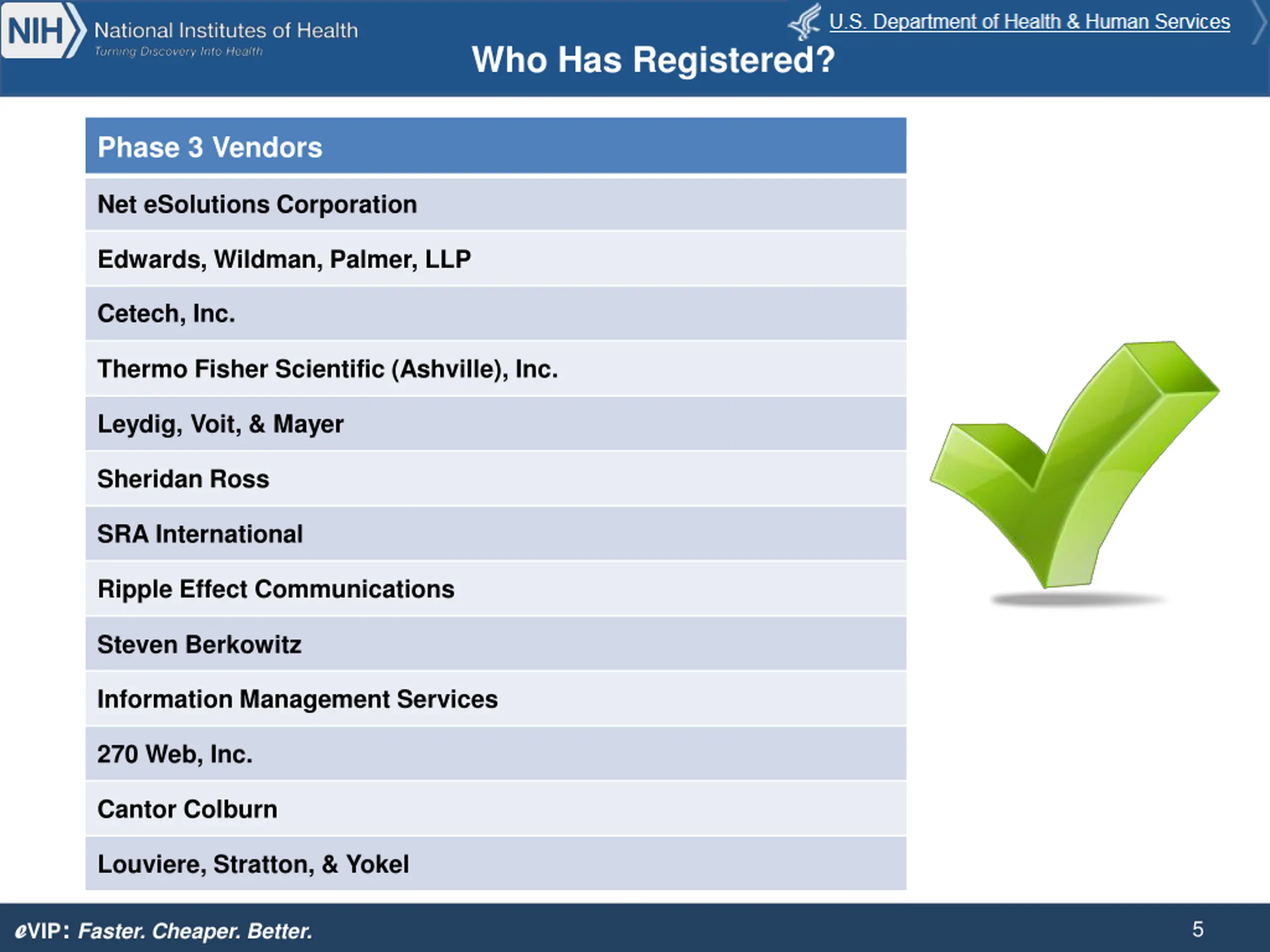 National Institutes of Health (NIH) - Turning Discovery Into Health Who Has Registered? Phase 3 Vendors Net eSolutions Corporation Edwards, Wildman, Palmer, LLP Cetech, Inc. Thermo Fisher Scientific (Ashville), Inc. Leydig, Voit, & Mayer Sheridan Ross SRA International Ripple Effect Communications Steven Berkowitz Information Management Services 270 Web, Inc. Cantor Colburn Louviere, Stratton, & Yokel eVIP: Faster. Cheaper. Better. 5