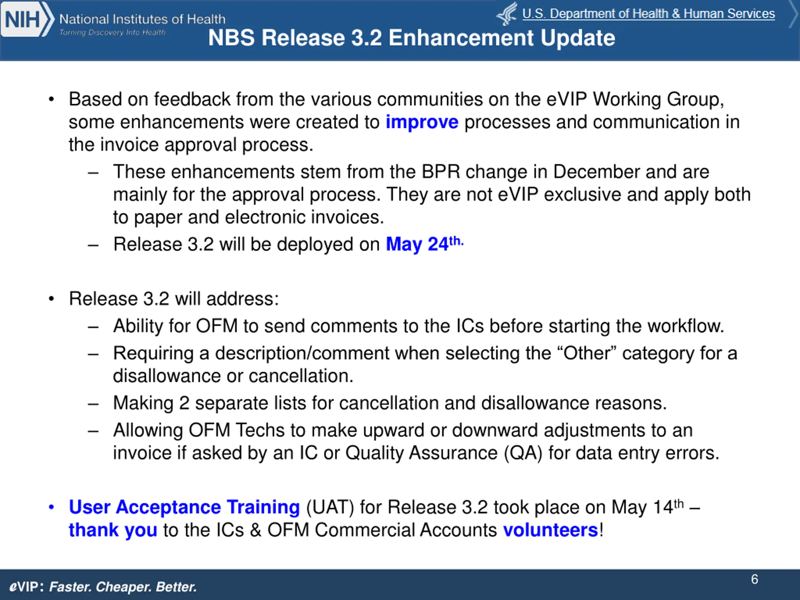 National Institutes of Health (NIH) - Turning Discovery Into Health NBS Release 3.2 Enhancement Update Based on feedback from the various communities on the eVIP Working Group, some enhancements were created to improve processes and communication in the invoice approval process. These enhancements stem from the BPR change in December and are mainly for the approval process. They are not eVIP exclusive and apply both to paper and electronic invoices. Release 3.2 will be deployed on May 24th. Release 3.2 will address: Ability for OFM to send comments to the ICs before starting the workflow. Requiring a description/comment when selecting the Other category for a disallowance or cancellation. Making 2 separate lists for cancellation and disallowance reasons. Allowing OFM Techs to make upward or downward adjustments to an invoice if asked by an IC or Quality Assurance (QA) for data entry errors. User Acceptance Training (UAT) for Release 3.2 took place on May 14th thank you to the ICs & OFM Commercial Accounts volunteers! 6 eVIP: Faster. Cheaper. Better.