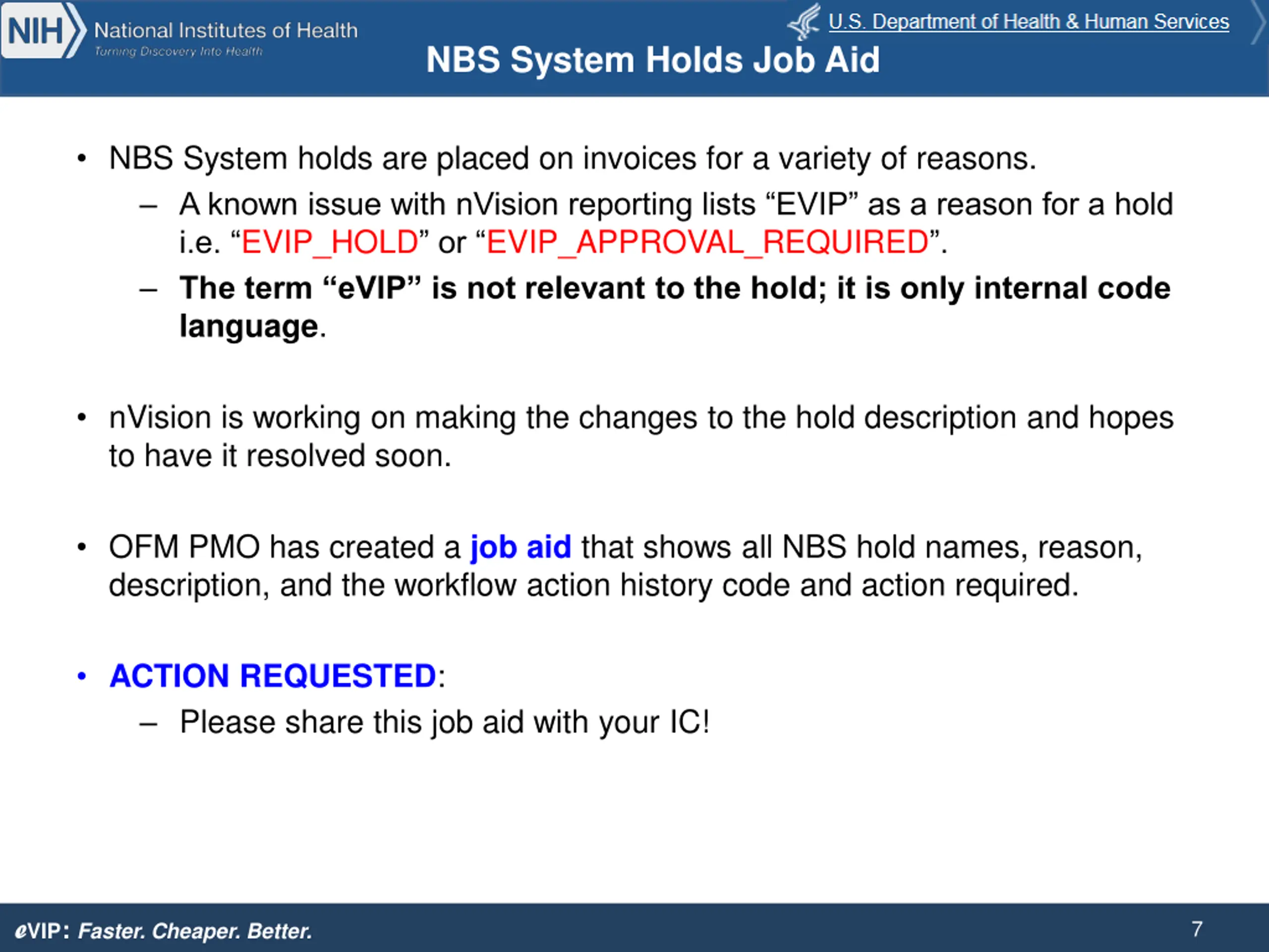 National Institutes of Health (NIH) - Turning Discovery Into Health NBS System Holds Job Aid NBS System holds are placed on invoices for a variety of reasons. A known issue with nVision reporting lists EVIP as a reason for a hold i.e. EVIP_HOLD or EVIP_APPROVAL_REQUIRED . The term eVIP is not relevant to the hold; it is only internal code language. nVision is working on making the changes to the hold description and hopes to have it resolved soon. OFM PMO has created a job aid that shows all NBS hold names, reason, description, and the workflow action history code and action required. ACTION REQUESTED: Please share this job aid with your IC! eVIP: Faster. Cheaper. Better. 7