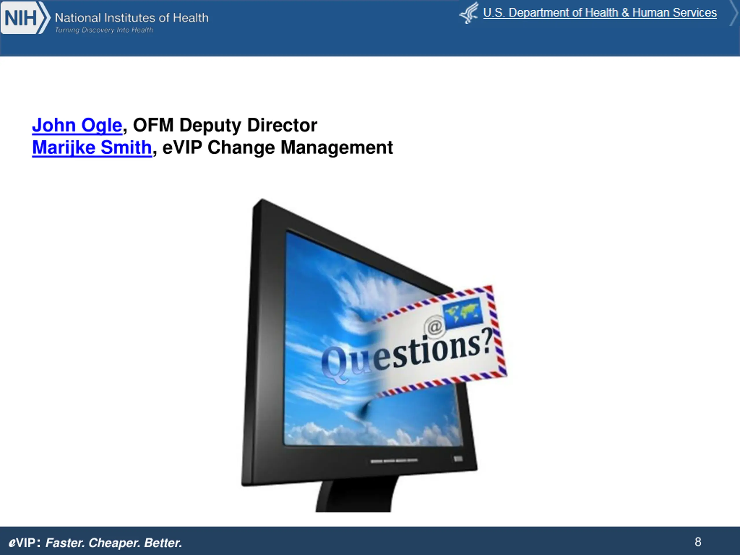 National Institutes of Health (NIH) - Turning Discovery Into Health John Ogle, OFM Deputy Director Marijke Smith, eVIP Change Management eVIP: Faster. Cheaper. Better. 8